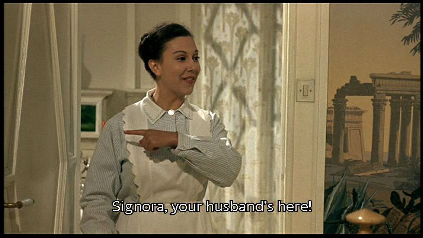 I'm sick of this dress! Throw it out. This thing too! Here, you can have it. [Teresina] Signora, do you know what you're getting for your anniversary? Your gift for him is so beautiful. Signora, your husband's here! Get off the bed, you! |