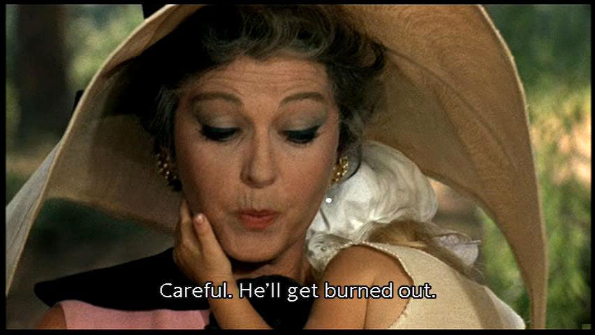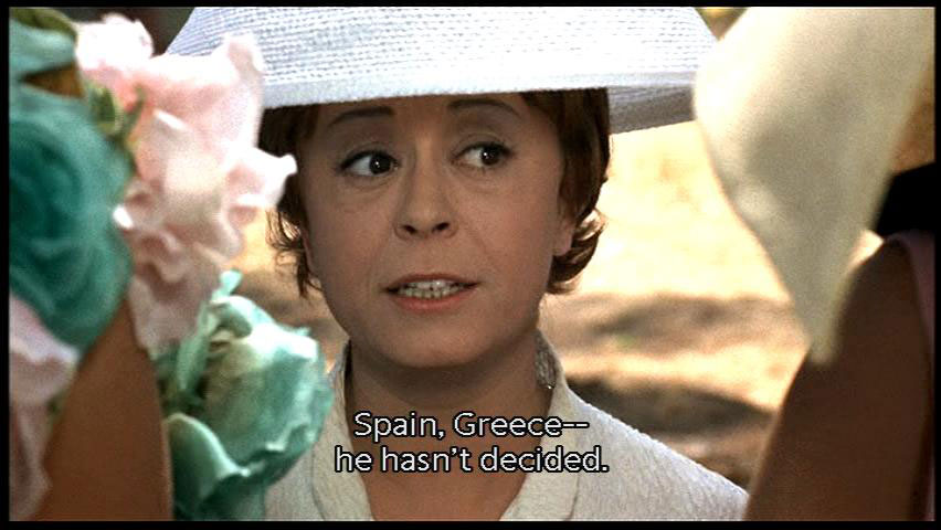 [Adele] Is he ever home? [Juliet] He comes in at night after work. [Adele] Careful. He'll get burned out. [Juliet] But he said we'll take a nice holiday. We'll go on a cruise. Spain, Greece -- he hasn't decided. I have the brochures. |