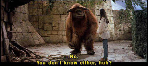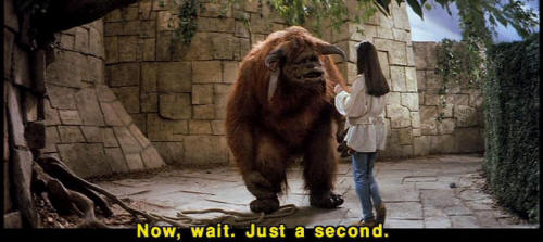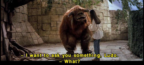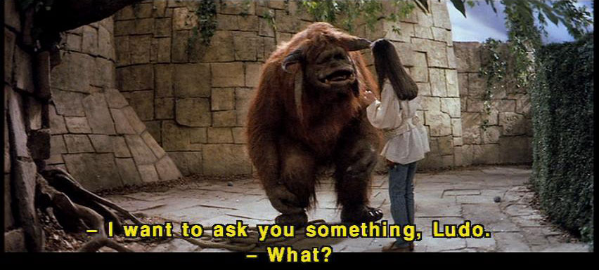 [Sarah] Are you okay? [Ludo] Sarah friend. [Sarah] Now, wait. Just a second. [Sarah] I want to ask you something, Ludo. [Ludo] What? [Sarah] I have to get to the castle at the labyrinth's center. Do you know the way? [Ludo] No. [Sarah] You don't know either, huh? [Sarah] I wonder if anyone knows how to get through this labyrinth. |