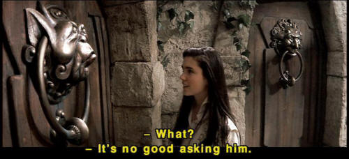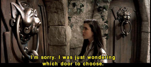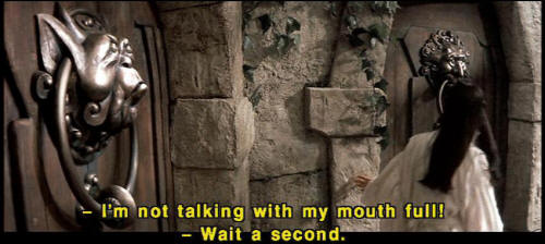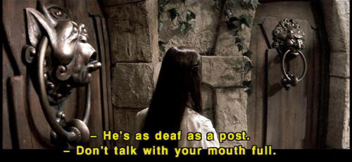 [Knocker] It's very rude to stare! [Sarah] I'm sorry. I was just wondering which door to choose. [Knocker] What? [Knocker] It's no good asking him. [Knocker] He's as deaf as a post. [Knocker] Don't talk with your mouth full. [Knocker] I'm not talking with my mouth full! [Sarah] Wait a second. [Sarah] I can't understand you. What were you saying? |