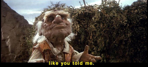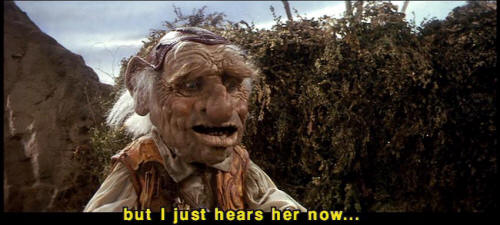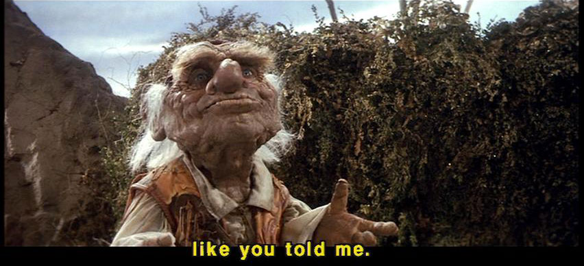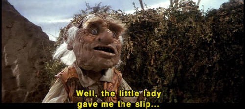 [Hoggle] Well, the little lady gave me the slip ... [Hoggle] but I just hears her now ... [Hoggle] so I was about to lead her back to the beginning ... [Hoggle] like you told me. [Jareth] I see. [Sarah] Ludo! [Jareth] For one moment I thought you were running to help her. [Jareth] But no, not after my warnings. |