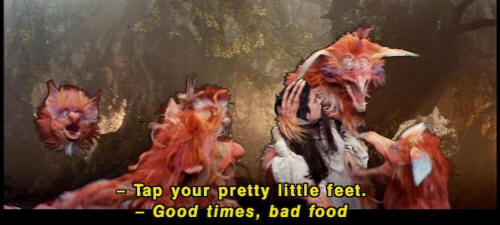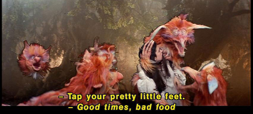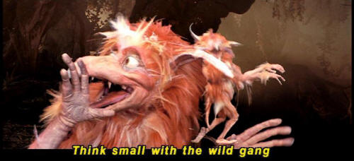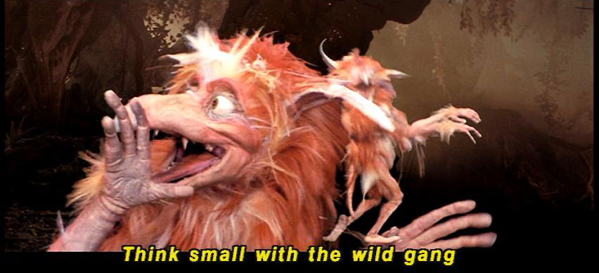 [Goblin] Chilly down with the wild gang [Goblin] Think small [Goblin] Think small with the wild gang [Goblin] Bang heads! [Goblin] Bang heads with the wild gang [Goblin] Hey, listen up. [Goblin] When your thing gets wild, Chilly down, chilly down [Goblin] With the wild gang [Goblin] Shake your pretty little head. [Goblin] Act tall with the wild gang [Goblin] Tap your pretty little feet. [Goblin] Good times, bad food |