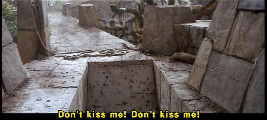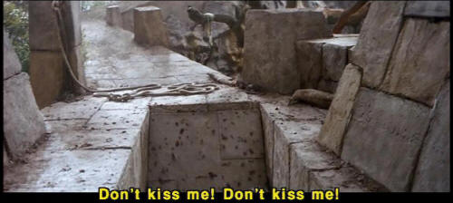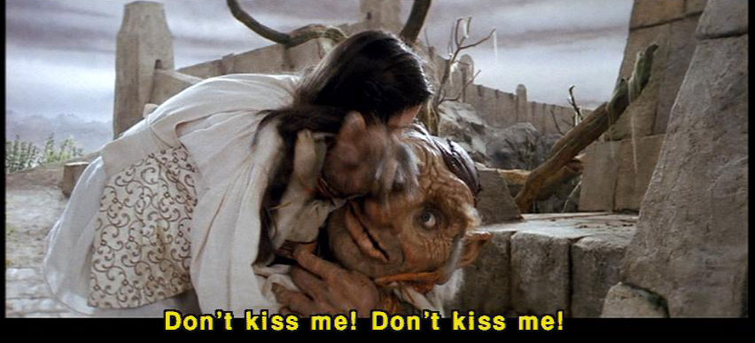 [Hoggle] Don't kiss me! Don't kiss me! [Hoggle] No, no, no! [Sarah] Hoggle, hold on. |