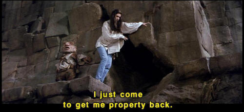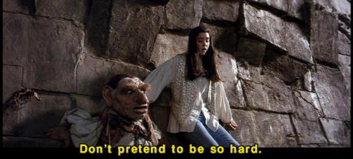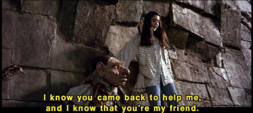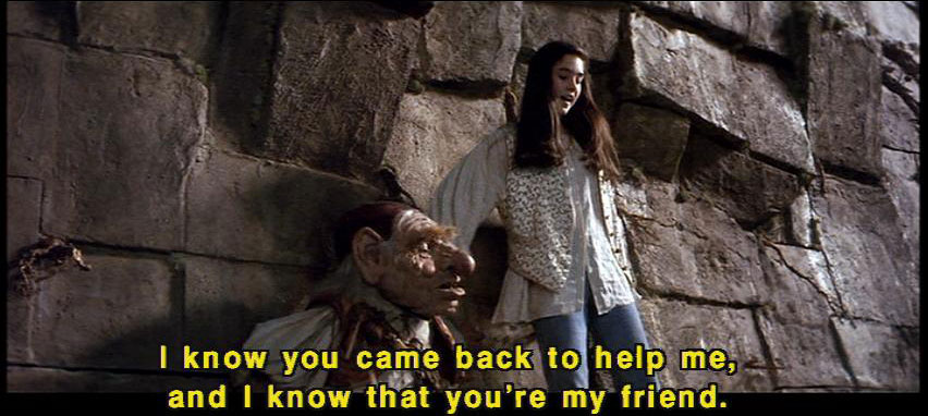 [Sarah] Oh, my gosh. [Sarah] Don't pretend to be so hard. [Sarah] I know you came back to help me, and I know that you're my friend. [Hoggle] Did not. Am not. [Hoggle] I just come to get me property back. [Hoggle] Oh, and ... [Hoggle] give you -- give you -- [Sarah] Give me what? |