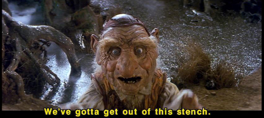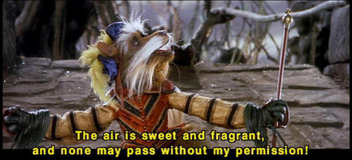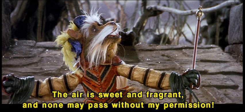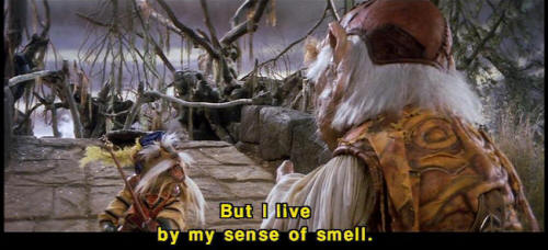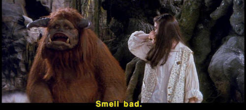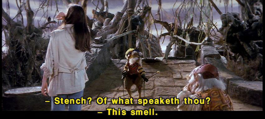 [Hoggle] We've gotta get out of this stench. [Ludo] Smell bad. [Sir Didymus] Stench? Of what speaketh thou? [Sarah] This smell. [Sir Dydmus] I smell nothing. [Hoggle] Oh, you're joking. [Sir Didymus] But I live by my sense of smell. [Sir Didymus] The air is sweet and fragrant, and none may pass without my permission! [Ludo] Smell bad. |