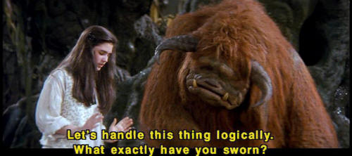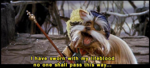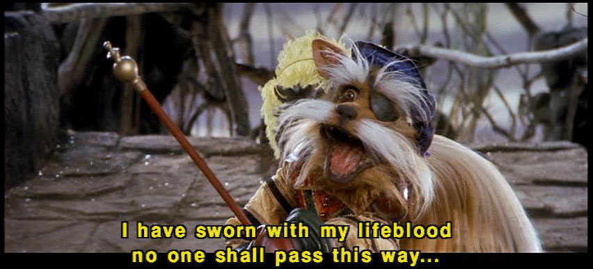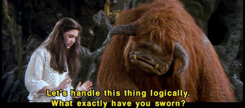 [Sir Didymus] I have taken an oath, and I must defend it to the death. [Ludo] The smell! [Sarah] Okay. [Sarah] Let's handle this thing logically. What exactly have you sworn? [Sir Didymus] I have sworn with my lifeblood no one shall pass this way ... [Sir Didymus] without my permission. [Sarah] Well, may we have your permission? [Sir Didymus] Well, I -- |