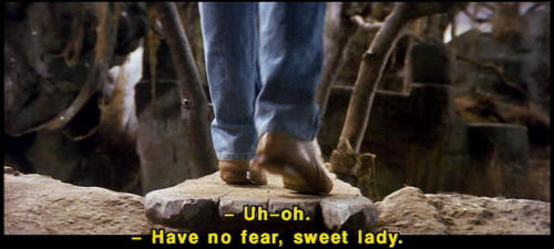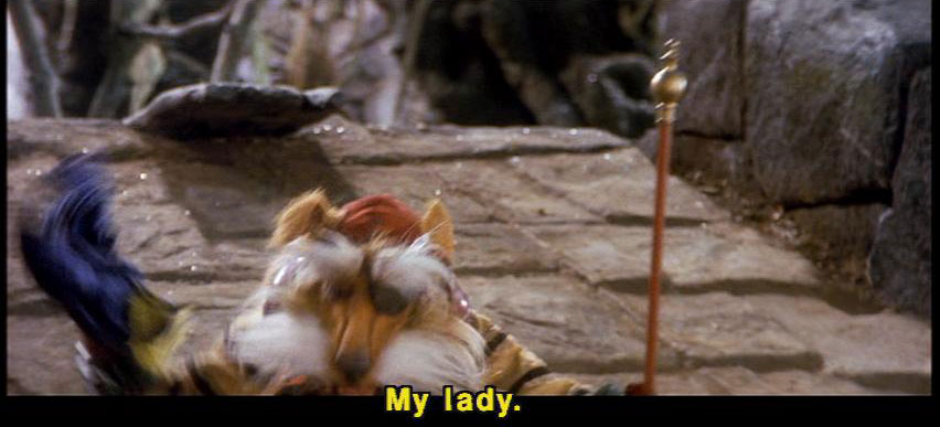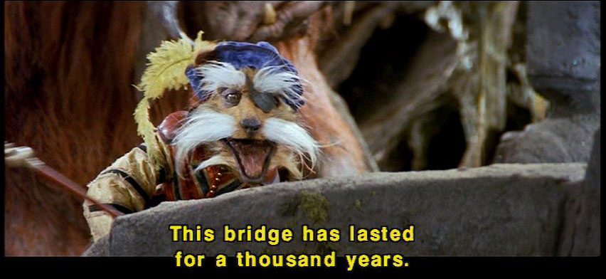 [Sir Didymus] Yes. [Sarah] Thank you, noble sir. [Sir Didymus] My lady. [Sarah] Uh-oh. [Sir Didymus] Have no fear, sweet lady. [Sir Didymus] This bridge has lasted for a thousand years. |
