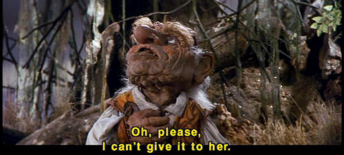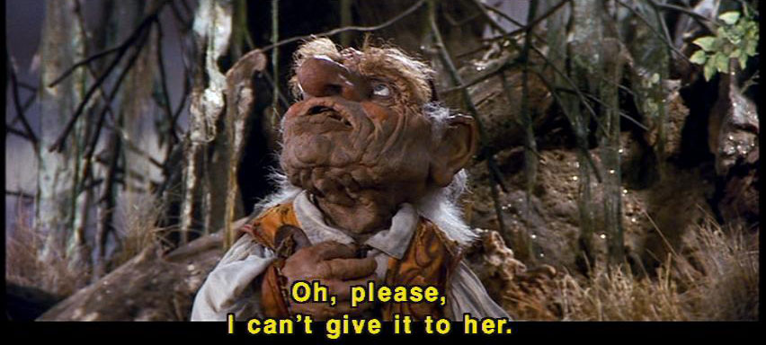 [Jareth] I wouldn't do that, if I were you. [Hoggle] Oh, please, I can't give it to her. [Sir Didymus] Come on then. We should reach the castle well before day. |