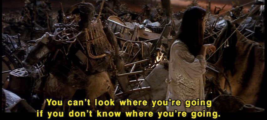 [Junk Lady] You can't look where you're going if you don't know where you're going. [Sarah] I was searching for something. [Junk Lady] Look here. [Sarah] Lancelot? [Sarah] Thank you. [Junk Lady] That's what you were looking for, wasn't it, my dear? [Sarah] Yes. I forgot. |