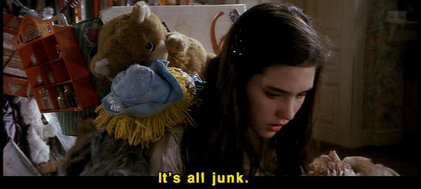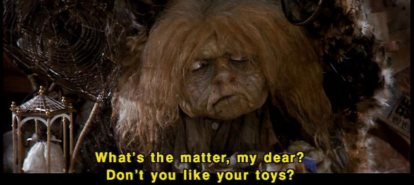 [Sarah] to take back the child that you have stolen." [Junk Lady] What's the matter, my dear? Don't you like your toys? [Sarah] It's all junk. [Junk Lady] Well, what about this? [Junk Lady] This is not junk, eh? [Sarah] Yes, it is! [Sarah] I have to save Toby! |