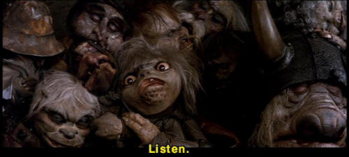 [Goblin] Listen. [Sarah] "Say your right words," the goblins said. [Sarah] "And we'll take the baby to the Goblin City ... [Sarah] and you will be free." |