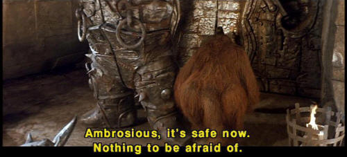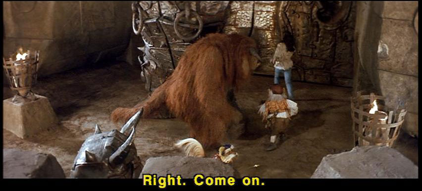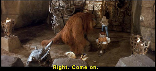 [Sarah] Here are your things. [Sarah] Thanks for your help. [Hoggle] Well, what are we waiting for? [Hoggle] Let's get the rat who calls himself Jareth. [Sarah] Right. Come on. [Sir Didymus] Ambrosious, it's safe now. Nothing to be afraid of. |