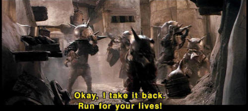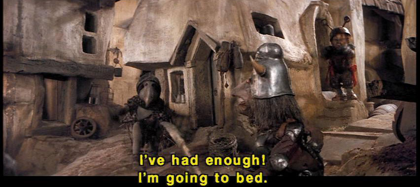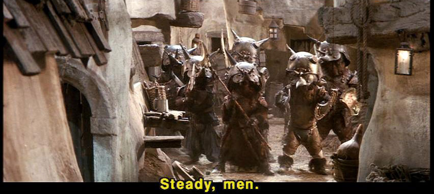 [Goblin] Good grief! [Goblin] Steady, men. [Goblin] Steady, men. Hold your ground. [Goblin] Okay, I take it back. Run for your lives! [Goblin] I've had enough! I'm going to bed. |