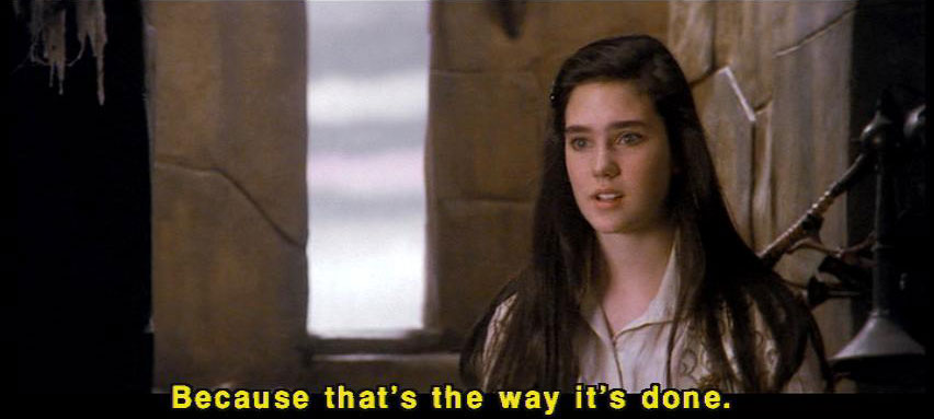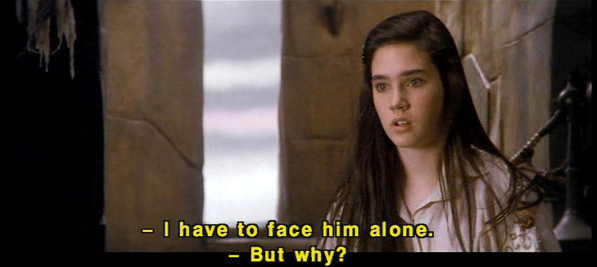 [Sarah] No. [Sir Didymus] Good boy. Come on. [Sarah] That's the only way he could have gone. [Sir Didymus] Well, then, come on. [Sarah] I have to face him alone. [Sir Didymus] But why? [Hoggle] Yes, why? [Sarah] Because that's the way it's done. |