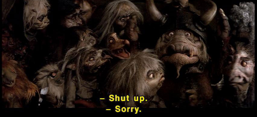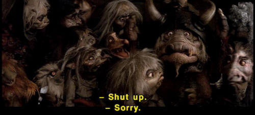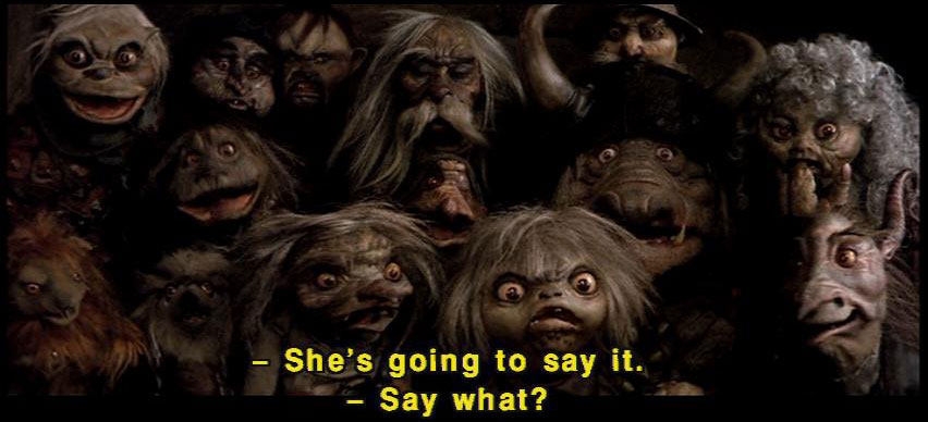[Sarah] No, I mustn't. I mustn't say. [Sarah] I wish -- [Sarah] I wish -- [Goblin] She's going to say it. [Goblin] Say what? [Goblin] Shut up. [Goblin] Sorry. [Goblin] You shut up. [Goblin] Listen. She's going to say the words. [Sarah] I can bear it no longer! |