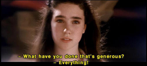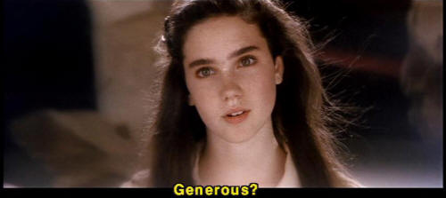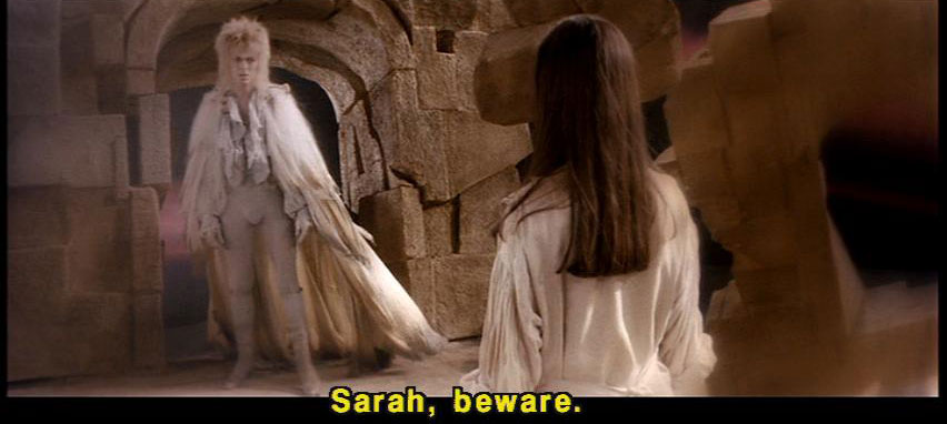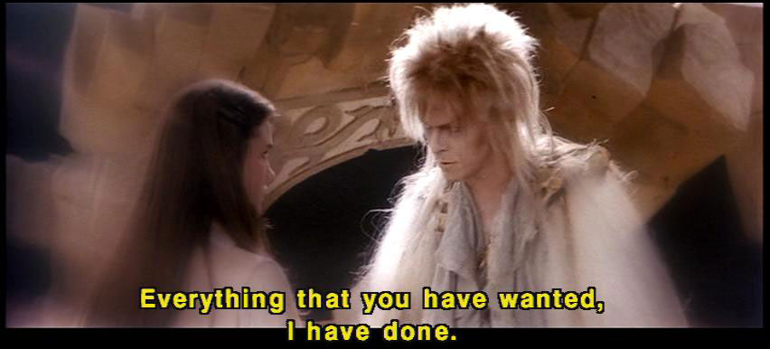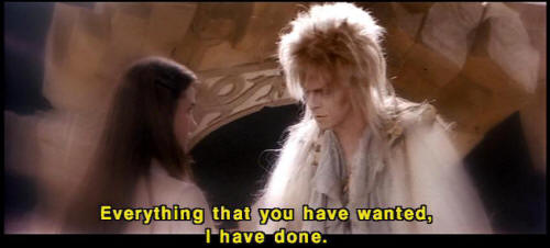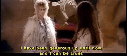 [Jareth] Sarah, beware. [Jareth] I have been generous up until now, and I can be cruel. [Sarah] Generous? [Sarah] What have you done that's generous? [Jareth] Everything! [Jareth] Everything that you have wanted, I have done. [Jareth] You asked that the child be taken. I took him. |