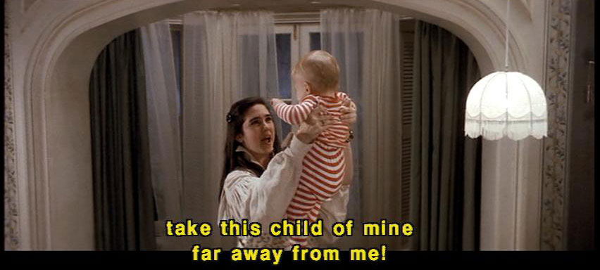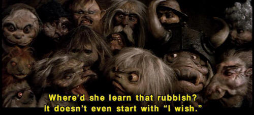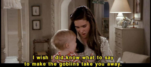 [Sarah] Goblin King, Goblin King, wherever you may be ... [Sarah] take this child of mine far away from me! [Goblin] No! [Goblin] That's not it. [Goblin] Where'd she learn that rubbish? It doesn't even start with 'I wish." [Sarah] Toby, stop it! [Sarah] I wish I did know what to say to make the goblins take you away. |
