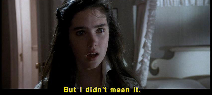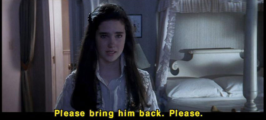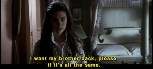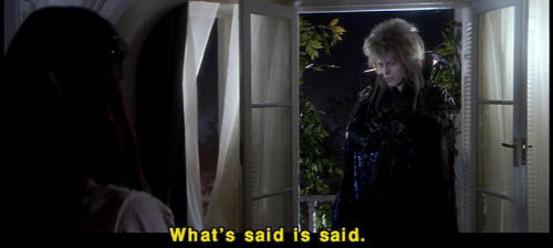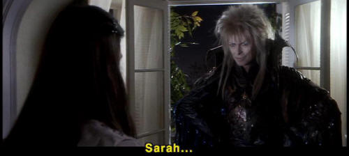 [Sarah] I want my brother back, please, if it's all the same. [Jareth] What's said is said. [Sarah] But I didn't mean it. [Jareth] Oh, you didn't. [Sarah] Please. [Sarah] Where is he? [Jareth] You know very well where he is. [Sarah] Please bring him back. Please. [Jareth] Sarah ... |