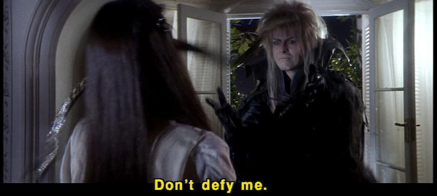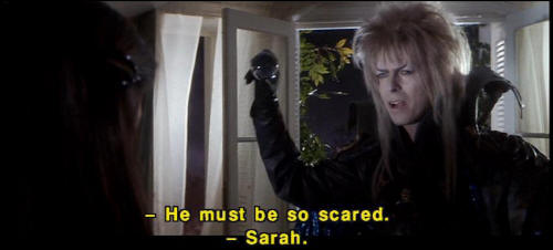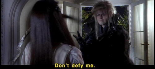 [Sarah] I appreciate what you're trying to do for me, but I want my brother back. [Sarah] He must be so scared. [Jareth] Sarah. [Jareth] Don't defy me. |