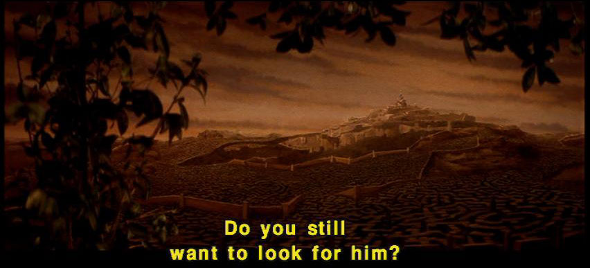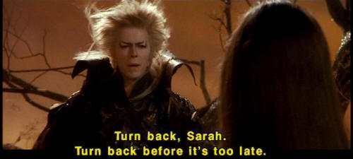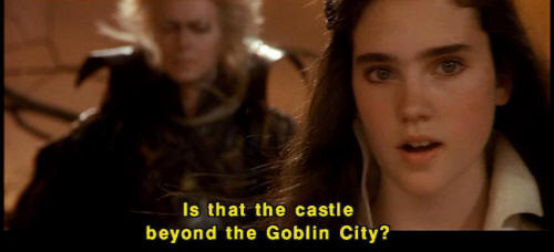 [Jareth] He's there, in my castle. [Jareth] Do you still want to look for him? [Sarah] Is that the castle beyond the Goblin City? [Jareth] Turn back, Sarah. Turn back before it's too late. [Sarah] I can't. |