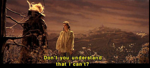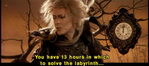 [Sarah] Don't you understand that I can't? [AB-1] [Jareth] What a pity. [Sarah] It doesn't look that far. [Jareth] It's further than you think. Time is short. [Jareth] You have 13 hours in which to solve the labyrinth ... |
