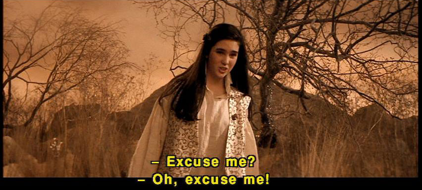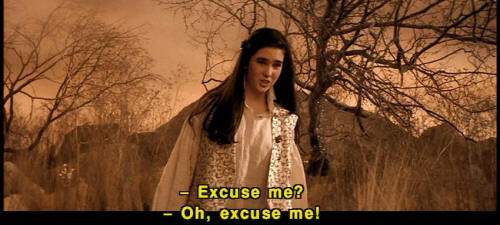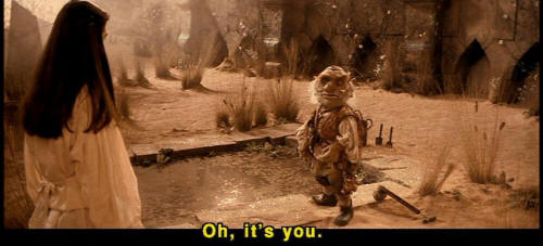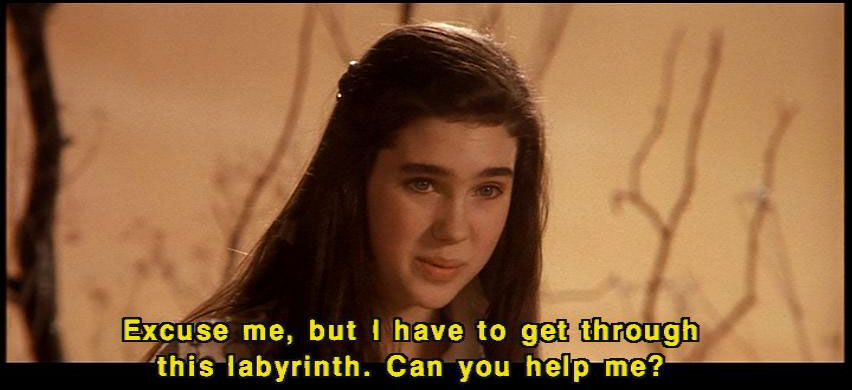 [Sarah] Excuse me? [Hoggle] Oh, excuse me! [Hoggle] Oh, it's you. [Sarah] Excuse me, but I have to get through this labyrinth. Can you help me? [Sarah] Oh, how sweet. |