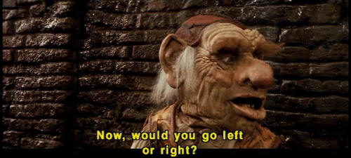 [Hoggle] Cozy, isn't it? [Hoggle] Now would you go left or right? [Sarah] They both look the same [Hoggle] Well, you're not gonna get very far. |