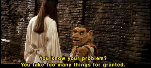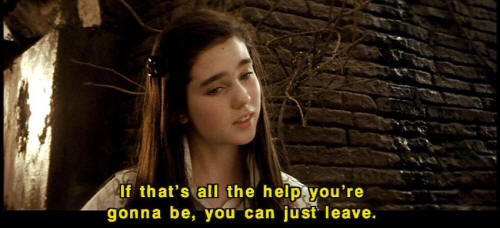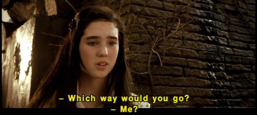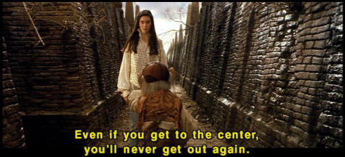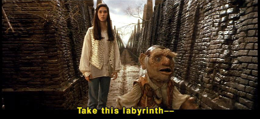 [Sarah] Which way would you go? [Hoggle] Me? [Hoggle] I wouldn't go either way. [Sarah] If that's all the help you're gonna be, you can just leave. [Hoggle] You know your problem? You take too many things for granted. [Hoggle] Take this labyrinth -- [Hoggle] Even if you get to the center, you'll never get out again. [Sarah] That's your opinion. [Hoggle] It's a lot better than yours. [Sarah] Thanks for nothing, Hogwart. |