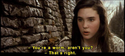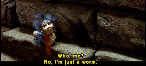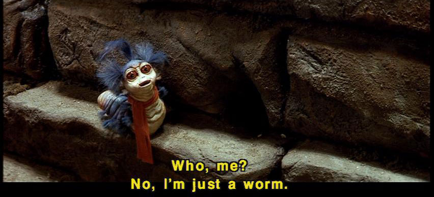 [Sarah] Did you say "hello"? [Worm] No, I said "allo," but that's close enough. [Sarah] You're a worm, aren't you? [Worm] That's right. [Sarah] You don't by any chance know the way through this labyrinth? [Worm] Who, me? No, I'm just a worm. [Worm] Come inside, meet the missus. [Sarah] No, thank you, but I have to solve this labyrinth. |