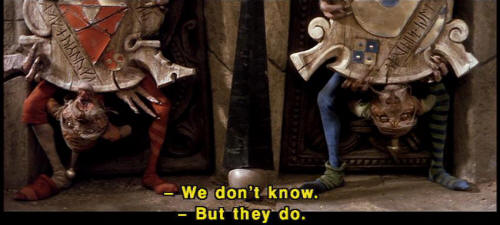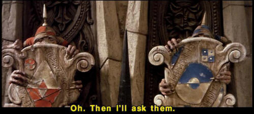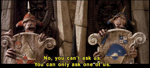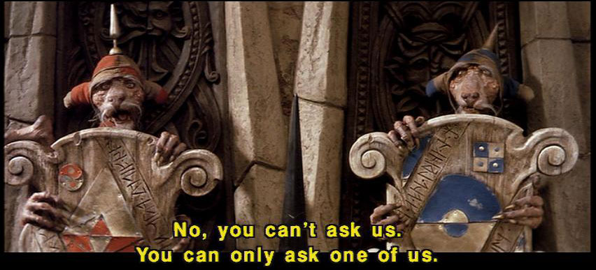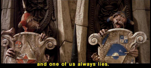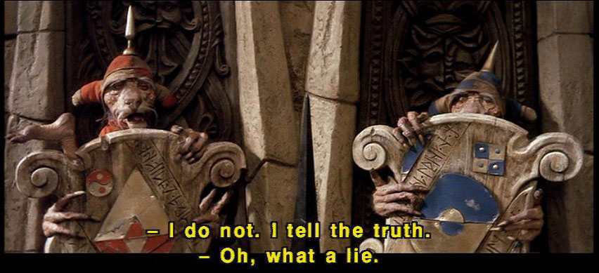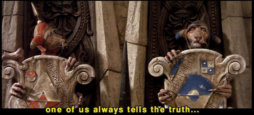 [Shield] We don't know. [Shield] But they do. [Sarah] Oh. Then I'll ask them. [Shield] No, you can't ask us. You can only ask one of us. [Shield] It's in the rules, and I should warn you ... [Shield] one of us always tells the truth ... [Shield] and one of us always lies. [Shield] That's a rule too. He always lies. [Shield] I do not. I tell the truth. [Shield] Oh, what a lie. |
