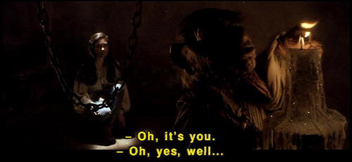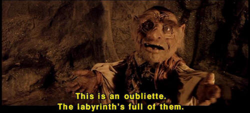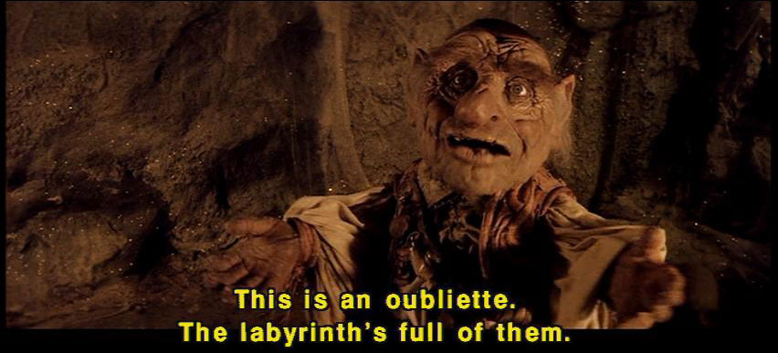 [Sarah] Oh, it's you. [Hoggle] Oh, yes, well ... [Hoggle] I knew you were gonna get into trouble as soon as I met you ... [Hoggle] so I've come to give you a hand. [Hoggle] Oh, you're looking around now, aren't you? [Hoggle] I suppose you noticed there ain't no doors. [Hoggle] Only the hole. [Hoggle] This is an oubliette. The labyrinth's full of them. |