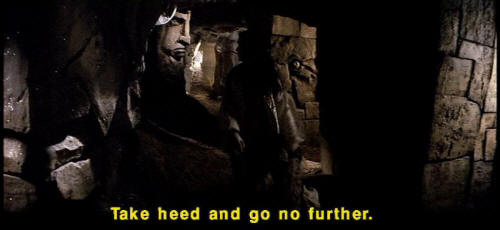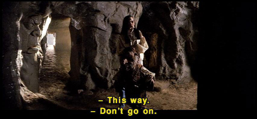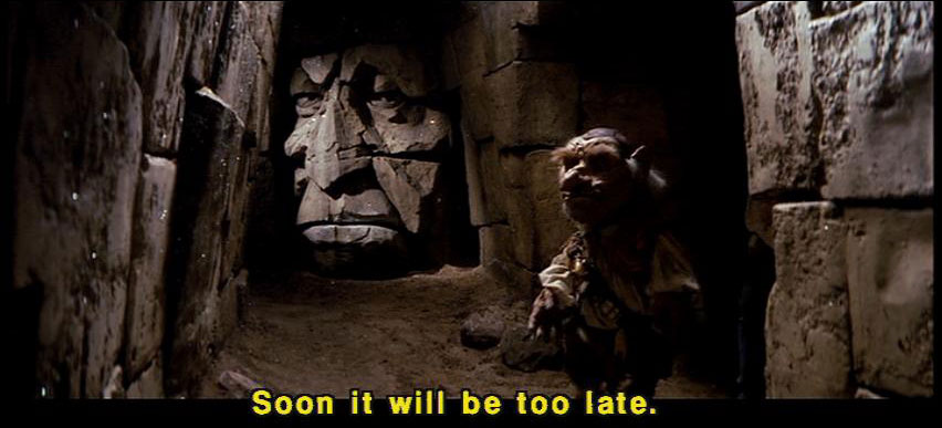 [Hoggle] This way. [Rock] Don't go on. [Rock] Go back while you still can. [Rock] This is not the way. [Rock] Take heed and go no further. [Rock] Beware. Beware. [Rock] Soon it will be too late. [Hoggle] Yeah! Don't pay any attention to them. [Hoggle] They're just false alarms. You get a lot of them in the labyrinth. |