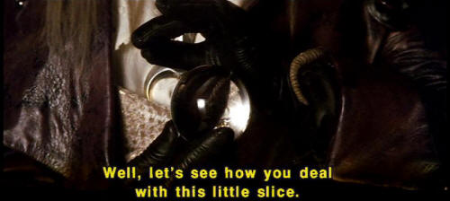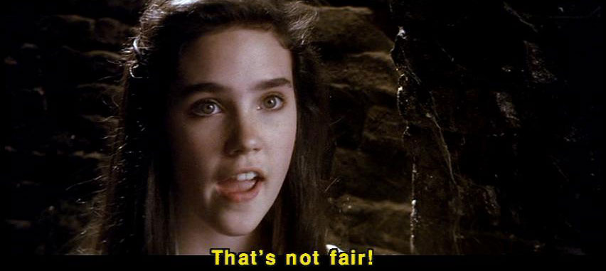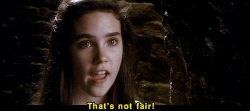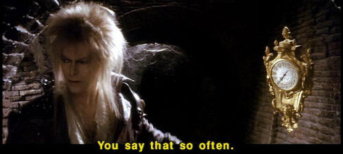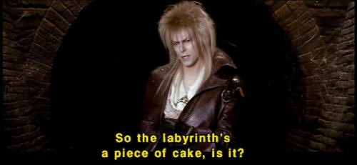 [Jareth] Hmm? [Sarah] That's not fair! [Jareth] You say that so often. [Jareth] I wonder what your basis for comparison is. [Jareth] So the labyrinth's a piece of cake, is it? [Jareth] Well, let's see how you deal with this little slice. [Hoggle] Oh, no, the cleaners! |