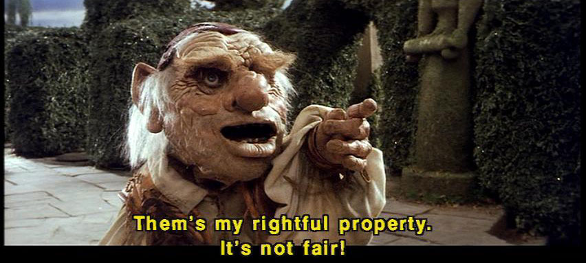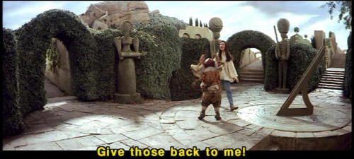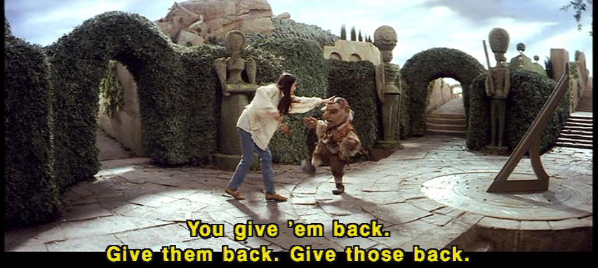 [Hoggle] Don't try to embarrass me. I've got not pride. [Sarah] Oh, yeah? [Hoggle] But them's my jewels! [Hoggle] You give 'em back. Give them back. Give those back. [Hoggle] Give those back to me! [Sarah] Now, there's the castle. Which way should we try? [Them's my rightful property. It's not fair! [Sarah] No, it isn't. |