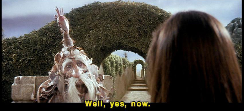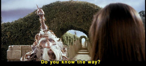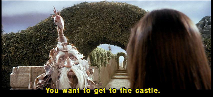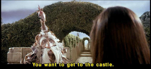 [Sarah] My friend. [Guru] Oh, yes. [Guru] And what can I do for you? [Sarah] Please, can you tell -- That is -- [Sarah] I have to get to the castle at the center of the labyrinth. [Sarah] Do you know the way? [Guru] Well, yes, now. [Guru] You want to get to the castle. |