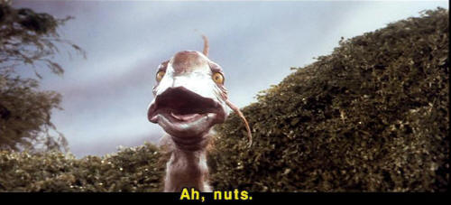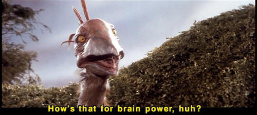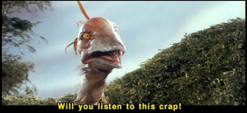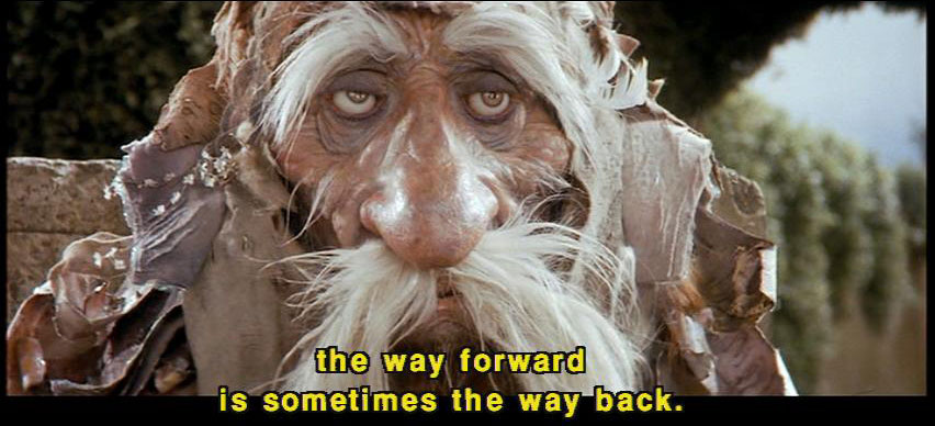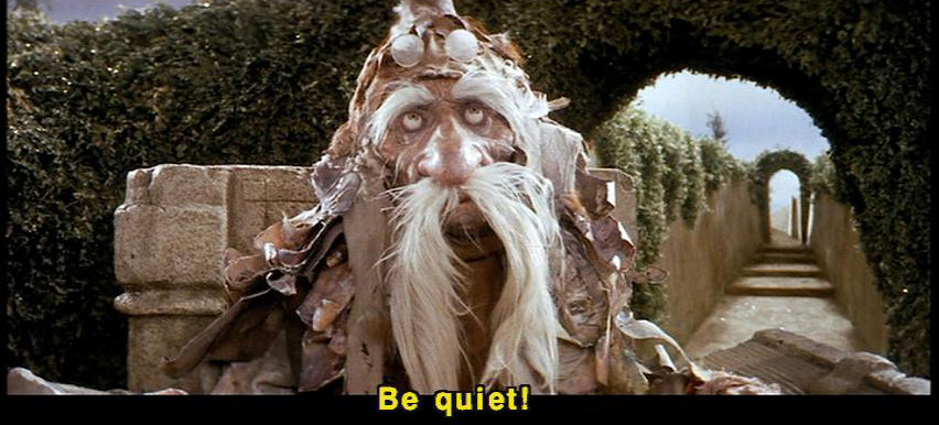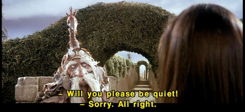 [Hat] How's that for brain power, huh? [Guru] Be quiet! [Hat] Ah, nuts. [Guru] So, young woman ... [Guru] the way forward is sometimes the way back. [Hat] Will you listen to this crap! [Guru] Will you please be quiet! [Hat] Sorry. All right. [Guru] Okay. [Hat] Okay! |