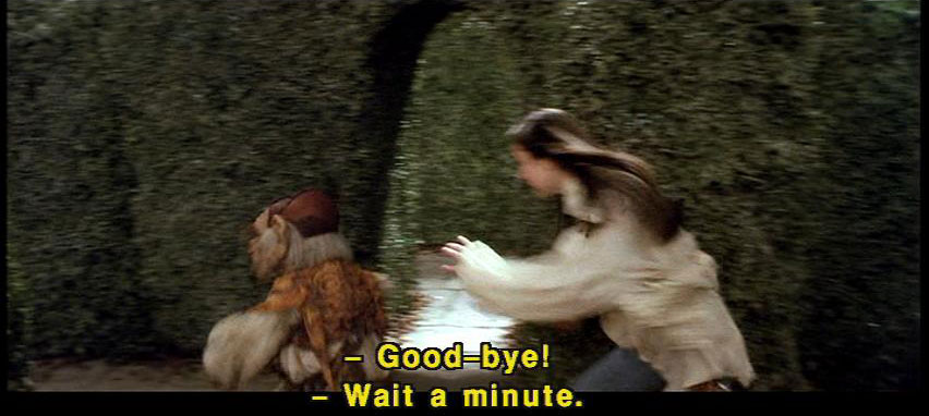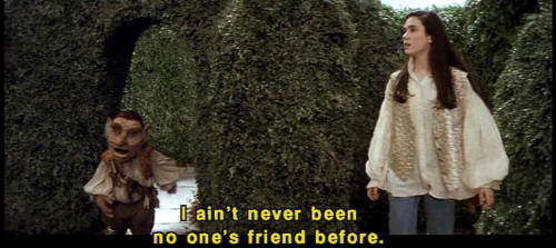 [Sarah] Because you are. [Sarah] You may not be much of a friend, but you're the only one I've got here. [Sarah] Do you hear something? [Sarah] No, it's all right. [Hoggle] Friend. [Hoggle] I like that. [Hoggle] I ain't never been no one's friend before. [Hoggle] Good-bye! [Sarah] Wait a minute. [Hoggle] Keep the stuff. [Sarah] Are you my friend or not? |