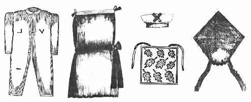 Below appears a list of the temple clothes. It should be noted that at certain stages of the endowment, participants are required to change their robes and caps from the left side of the body to the right side (the girdles are worn opposite the robe). This indicates a transition from officiating in the ordinances of the lower, or Aaronic Priesthood, to the higher, or Melchizedek Priesthood. Articles Necessary for Temple Endowment Work (This includes articles worn by couple at time of marriage) For men: White Robe (worn over the shoulder) For women: White Robe (worn over the shoulder) Below is a picture of the temple clothing from an old exposure of the endowment called "Lifting the Vail." It was published in The Daily Tribune (Salt Lake City, Utah), Sunday September 28, 1879. It shows the "old style" garment, a robe, a cap, an apron and a woman's veil (the head is placed in the hole, the diamond-shaped part hangs down the back, and the two strings are tied beneath the chin).