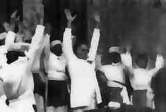 A scene from the prayer circle as they chant PAY LAY ALE, meaning, "O God, hear the words of my mouth!" The arms raised over their heads form the first part of the "Sign of the Second Token of the Melchezedek Priesthood, the Patriarchal Grip, or Sure Sign of the Nail." This page Copyright (c) 1996 by Vince Hoffer. |