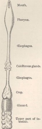 Fig. 1. Diagram of the alimentary canal of an earthworm (Lumbricus), copied from Ray Lankester in 'Quart. Journ. of Microscop. Soc.' vol. xv. N.S. pl. vii. The circulatory system is well developed. Worms breathe by their skin, as they do not possess any special respiratory organs. The two sexes are united in the same individual, but two individuals pair together. The nervous system is fairly well developed; and the two almost confluent cerebral ganglia are situated very near to the anterior end of the body. Senses.—Worms are destitute of eyes, and at first I thought that they were quite insensible to light; for those kept in confinement were repeatedly observed by the aid of a candle, and others out of doors by the aid of a lantern, yet they were rarely alarmed, although extremely timid animals. Other persons have found no difficulty in observing worms at night by the same means. [8] Hoffmeister, however, states [9] that worms, with the exception of a few individuals, are extremely sensitive to light; but he admits that in most cases a certain time is requisite for its action. These statements led me to watch on many successive nights worms kept in pots, which were protected from currents of air by means of glass plates. The pots were approached very gently, in order that no vibration of the floor should be caused. When under these circumstances worms were illuminated by a bull's-eye lantern having slides of dark red and blue glass, which intercepted so much light that they could be seen only with some difficulty, they were not at all affected by this amount of light, however long they were exposed to it. The light, as far as I could judge, was brighter than that from the full moon. Its colour apparently made no difference in the result. When they were illuminated by a candle, or even by a bright paraffin lamp, they were not usually affected at first. Nor were they when the light was alternately admitted and shut off. Sometimes, however, they behaved very differently, for as soon as the light fell on them, they withdrew into their burrows with almost instantaneous rapidity. This occurred perhaps once out of a dozen times. When they did not withdraw instantly, they often raised the anterior tapering ends of their bodies from the ground, as if their attention was aroused or as if surprise was felt; or they moved their bodies from side to side as if feeling for some object. They appeared distressed by the light; but I doubt whether this was really the case, for on two occasions after withdrawing slowly, they remained for a long time with their anterior extremities protruding a little from the mouths of their burrows, in which position they were ready for instant and complete withdrawal. When the light from a candle was concentrated by means of a large lens on the anterior extremity, they generally withdrew instantly; but this concentrated light failed to act perhaps once out of half a dozen trials. The light was on one occasion concentrated on a worm lying beneath water in a saucer, and it instantly withdrew into its burrow. In all cases the duration of the light, unless extremely feeble, made a great difference in the result; for worms left exposed before a paraffin lamp or a candle invariably retreated into their burrows within from five to fifteen minutes; and if in the evening the pots were illuminated before the worms had come out of their burrows, they failed to appear. From the foregoing facts it is evident that light affects worms by its intensity and by its duration. It is only the anterior extremity of the body, where the cerebral ganglia lie, which is affected by light, as Hoffmeister asserts, and as I observed on many occasions. If this part is shaded, other parts of the body may be fully illuminated, and no effect will be produced. As these animals have no eyes, we must suppose that the light passes through their skins, and in some manner excites their cerebral ganglia. It appeared at first probable that the different manner in which they were affected on different occasions might be explained, either by the degree of extension of their skin and its consequent transparency, or by some particular incidence of the light; but I could discover no such relation. One thing was manifest, namely that when worms were employed in dragging leaves into their burrows or in eating them, and even during the short intervals whilst they rested from their work, they either did not perceive the light or were regardless of it; and this occurred even when the light was concentrated on them through a large lens. So, again, whilst they are paired, they will remain for an hour or two out of their burrows, fully exposed to the morning light; but it appears from what Hoffmeister says that a light will occasionally cause paired individuals to separate. When a worm is suddenly illuminated and dashes like a rabbit into its burrow—to use the expression employed by a friend—we are at first led to look at the action as a reflex one. The irritation of the cerebral ganglia appears to cause certain muscles to contract in an inevitable manner, independently of the will or consciousness of the animal, as if it were an automaton. But the different effect which a light produced on different occasions, and especially the fact that a worm when in any way employed and in the intervals of such employment, whatever set of muscles and ganglia may then have been brought into play, is often regardless of light, are opposed to the view of the sudden withdrawal being a simple reflex action. With the higher animals, when close attention to some object leads to the disregard of the impressions which other objects must be producing on them, we attribute this to their attention being then absorbed; and attention implies the presence of a mind. Every sportsman knows that he can approach animals whilst they are grazing, fighting or courting, much more easily than at other times. The state, also, of the nervous system of the h