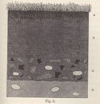Fig. 5. Section, reduced to half the natural scale, of the vegetable mould in a field, drained and reclaimed fifteen years previously; A, turf; B, vegetable mould without any stones; C, mould with fragments of burnt marl, coal-cinders and quartz pebbles; D, sub-soil of black, peaty sand with quartz pebbles. Two other cases are worth recording. In the spring of 1835, a field, which had long existed as poor pasture and was so swampy that it trembled slightly when stamped on, was thickly covered with red sand so that the whole surface appeared at first bright red. When holes were dug in this field after an interval of about 2½ years, the sand formed a layer at a depth of ¾ in. beneath the surface. In 1842 (i.e., 7 years after the sand had been laid on) fresh holes were dug, and now the red sand formed a distinct layer, 2 inches beneath the surface, or 1½ inch beneath the turf; so that on an average, .21 inches of mould had been annually brought to the surface. Immediately beneath the layer of red sand, the original substratum of black sandy peat extended. A grass field, likewise not far from Maer Hall, had formerly been thickly covered with marl, and was then left for several years as pasture; it was afterwards ploughed. A friend had three trenches dug in this field 28 years after the application of the marl, [1] and a layer of the marl fragments could be traced at a depth, carefully measured, of 12 inches in some parts, and of 14 inches in other parts. This difference in depth depended on the layer being horizontal, whilst the surface consisted of ridges and furrows from the field having been ploughed. The tenant assured me that it had never been turned up to a greater depth than from 6 to 8 inches; and as the fragments formed an unbroken horizontal layer from 12 to 14 inches beneath the surface, these must have been buried by the worms whilst the land was in pasture before it was ploughed, for otherwise they would have been indiscriminately scattered by the plough throughout the whole thickness of the soil. Four-and-a-half years afterwards I had three holes dug in this field, in which potatoes had been lately planted, and the layer of marl-fragments was now found 13 inches beneath the bottoms of the furrows, and therefore probably 15 inches beneath the general level of the field. It should, however, be observed that the thickness of the blackish sandy soil, which had been thrown up by the worms above the marl-fragments in the course of 32½ years, would have measured less than 15 inches, if the field had always remained as pasture, for the soil would in this case have been much more compact. The fragments of marl almost rested on an undisturbed sub-stratum of white sand with quartz pebbles; and as this would be little attractive to worms, the mould would hereafter be very slowly increased by their action. We will now give some cases of the action of worms, on land differing widely from the dry sandy or the swampy pastures just described. The chalk formation extends all round my house in Kent; and its surface, from having been exposed during an immense period to the dissolving action of rain-water, is extremely irregular, being abruptly festooned and penetrated by many deep well-like cavities. [2] During the dissolution of the chalk, the insoluble matter, including a vast number of unrolled flints of all sizes, has been left on the surface and forms a bed of stiff red clay, full of flints, and generally from 6 to 14 feet in thickness. Over the red clay, wherever the land has long remained as pasture, there is a layer a few inches in thickness, of dark-coloured vegetable mould. A quantity of broken chalk was spread, on December 20, 1842, over a part of a field near my house, which had existed as pasture certainly for 30, probably for twice or thrice as many years. The chalk was laid on the land for the sake of observing at some future period to what depth it would become buried. At the end of November, 1871, that is after an interval of 29 years, a trench was dug across this part of the field; and a line of white nodules could be traced on both sides of the trench, at a depth of 7 inches from the surface. The mould, therefore, (excluding the turf) had here been thrown up at an average rate of .22 inches per year. Beneath the line of chalk nodules there was in parts hardly any fine earth free of flints, while in other parts there was a layer, 2¼ inches in thickness. In this latter case the mould was altogether 9¼ inches thick; and in one such spot a nodule of chalk and a smooth flint pebble, both of which must have been left at some former time on the surface, were found at this depth. At from 11 to 12 inches beneath the surface, the undisturbed reddish clay, full of flints, extended. The appearance of the above nodules of chalk surprised me much at first, as they closely resembled water-worn pebbles, whereas the freshly-broken fragments had been angular. But on examining the nodules with a lens, they no longer appeared water-worn, for their surfaces were pitted through unequal corrosion, and minute, sharp points, formed of broken fossil shells, projected from them. It was evident that the corners of the original fragments of chalk had been wholly dissolved, from presenting a large surface to the carbonic acid dissolved in the rain-water and to that generated in soil containing vegetable matter, as well as to the humus-acids. [3] The projecting corners would also, relatively to the other parts, have been embraced by a larger number of living rootlets; and these have the power of even attacking marble, as Sachs has shown. Thus, in the course of 29 years, buried angular fragments of chalk had been converted into well-rounded nodules. Another part of this same field was mossy, and as it was thought that sifted coal-cinders would improve the pasture, a thick layer was spread over this part either in 1842 or 1843, and another layer some years afterwards. In 1871 a trench was here dug, and ma