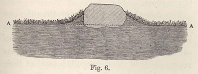 Fig. 6. Transverse section across a large stone, which had lain on a grass-field for 35 years. A A, general level of the field. The underlying brick rubbish has not been represented. Scale ½ inch to one foot. The second stone was larger than the one just described, viz., 67 inches in length, 39 in breadth, and 15 in thickness. The lower surface was nearly flat, so that the worms must soon have been compelled to eject their castings beyond its circumference. The stone as a whole had sunk about 2 inches into the ground. At this rate it would have required 262 years for its upper surface to have sunk to the general level of the field. The upwardly sloping, turf-covered border round the stone was broader than in the last case, viz., from 14 to 16 inches; and why this should be so, I could see no reason. In most parts this border was not so high as in the last case, viz., from 2 to 2½ inches, but in one place it was as much as 5½. Its average height close to the stone was probably about 3 inches, and it thinned out to nothing. If so, a layer of fine earth, 15 inches in breadth and 1½ inch in average thickness, of sufficient length to surround the whole of the much elongated slab, must have been brought up by the worms in chief part from beneath the stone in the course of 35 years. This amount would be amply sufficient to account for its having sunk about 2 inches into the ground; more especially if we bear in mind that a good deal of the finest earth would have been washed by heavy rain from the castings ejected on the sloping border down to the level of the field. Some fresh castings were seen close to the stone. Nevertheless, on digging a large hole to a depth of 18 inches where the stone had lain, only two worms and a few burrows were seen, although the soil was damp and seemed favourable for worms. There were some large colonies of ants beneath the stone, and possibly since their establishment the worms had decreased in number. The third stone was only about half as large as the others; and two strong boys could together have rolled it over. I have no doubt that it had been rolled over at a moderately recent time, for it now lay at some distance from the two other stones at the bottom of a little adjoining slope. It rested also on fine earth, instead of partly on brick-rubbish. In agreement with this conclusion, the raised surrounding border of turf was only 1 inch high in some parts, and 2 inches in other parts. There were no colonies of ants beneath this stone, and on digging a hole where it had lain, several burrows and worms were found. At Stonehenge, some of the outer Druidical stones are now prostrate, having fallen at a remote but unknown period; and these have become buried to a moderate depth in the ground. They are surrounded by sloping borders of turf, on which recent castings were seen. Close to one of these fallen stones, which was 17 ft. long, 6 ft. broad, and 28½ inches thick, a hole was dug; and here the vegetable mould was at least 9½ inches in thickness. At this depth a flint was found, and a little higher up on one side of the hole a fragment of glass. The base of the stone lay about 9½ inches beneath the level of the surrounding ground, and its upper surface 19 inches above the ground. A hole was also dug close to a second huge stone, which in falling had broken into two pieces; and this must have happened long ago, judging from the weathered aspect of the fractured ends. The base was buried to a depth of 10 inches, as was ascertained by driving an iron skewer horizontally into the ground beneath it. The vegetable mould forming the turf-covered sloping border round the stone, on which many castings had recently been ejected, was 10 inches in thickness; and most of this mould must have been brought up by worms from beneath its base. At a distance of 8 yards from the stone, the mould was only 5½ inches in thickness (with a piece of tobacco pipe at a depth of 4 inches), and this rested on broken flint and chalk which could not have easily yielded to the pressure or weight of the stone. A straight rod was fixed horizontally (by the aid of a spirit-level) across a third fallen stone, which was 7 feet 9 inches long; and the contour of the projecting parts and of the adjoining ground, which was not quite level, was thus ascertained, as shown in the accompanying diagram (Fig. 7) on a scale of ½ inch to a foot. The turf-covered border sloped up to the stone on one side to a height of 4 inches, and on the opposite side to only 2½ inches above the general level. A hole was dug on the eastern side, and the base of the stone was here found to lie at a depth of 4 inches beneath the general level of the ground, and of 8 inches beneath the top of the sloping turf-covered border.