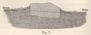Fig. 7. Section through one of the fallen Druidical stones at Stonehenge, showing how much it had sunk into the ground. Scale ½ inch to 1 foot. Sufficient evidence has now been given showing that small objects left on the surface of the land where worms abound soon get buried, and that large stones sink slowly downwards through the same means. Every step of the process could be followed, from the accidental deposition of a single casting on a small object lying loose on the surface, to its being entangled amidst the matted roots of the turf, and lastly to its being embedded in the mould at various depths beneath the surface. When the same field was re-examined after the interval of a few years, such objects were found at a greater depth than before. The straightness and regularity of the lines formed by the embedded objects, and their parallelism with the surface of the land, are the most striking features of the case; for this parallelism shows how equably the worms must have worked; the result being, however, partly the effect of the washing down of the fresh castings by rain. The specific gravity of the objects does not affect their rate of sinking, as could be seen by porous cinders, burnt marl, chalk and quartz pebbles, having all sunk to the same depth within the same time. Considering the nature of the substratum, which at Leith Hill Place was sandy soil including many bits of rock, and at Stonehenge, chalk-rubble with broken flints; considering, also, the presence of the turf-covered sloping border of mould round the great fragments of stone at both these places, their sinking does not appear to have been sensibly aided by their weight, though this was considerable. [9] On the number of worms which live within a given space.—We will now show, firstly, what a vast number of worms live unseen by us beneath our feet, and, secondly, the actual weight of the earth which they bring up to the surface within a given space and within a given time. Hensen, who has published so full and interesting an account of the habits of worms, [10] calculates, from the number which he found in a measured space, that there must exist 133,000 living worms in a hectare of land, or 53,767 in an acre. This latter number of worms would weigh 356 pounds, taking Hensen's standard of the weight of a single worm, namely, one gram. It should, however, be noted that this calculation is founded on the numbers found in a garden, and Hensen believes that worms are here twice as numerous as in corn-fields. The above result, astonishing though it be, seems to me credible, judging from the number of worms which I have sometimes seen, and from the number daily destroyed by birds without the species being exterminated. Some barrels of bad ale were left on Mr. Miller's land, [11] in the hope of making vinegar, but the vinegar proved bad, and the barrels were upset. It should be premised that acetic acid is so deadly a poison to worms that Perrier found that a glass rod dipped into this acid and then into a considerable body of water in which worms were immersed, invariably killed them quickly. On the morning after the barrels had been upset, "the heaps of worms which lay dead on the ground were so amazing, that if Mr. Miller had not seen them, he could not have thought it possible for such numbers to have existed in the space." As further evidence of the large number of worms which live in the ground, Hensen states that he found in a garden sixty-four open burrows in a space of 14½ square feet, that is, nine in 2 square feet. But the burrows are sometimes much more numerous, for when digging in a grass-field near Maer Hall, I found a cake of dry earth, as large as my two open hands, which was penetrated by seven burrows, as large as goose-quills. Weight of the earth ejected from a single burrow, and from all the burrows within a given space.—With respect to the weight of the earth daily ejected by worms, Hensen found that it amounted, in the case of some worms which he kept in confinement, and which he appears to have fed with leaves, to only 0.5 gram, or less than 8 grains per diem. But a very much larger amount must be ejected by worms in their natural state, at the periods when they consume earth as food instead of leaves, and when they are making deep burrows. This is rendered almost certain by the following weights of the castings thrown up at the mouths of single burrows; the whole of which appeared to have been ejected within no long time, as was certainly the case in several instances. The castings were dried (excepting in one specified instance) by exposure during many days to the sun or before a hot fire. WEIGHT OF THE CASTINGS ACCUMULATED