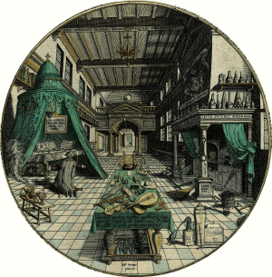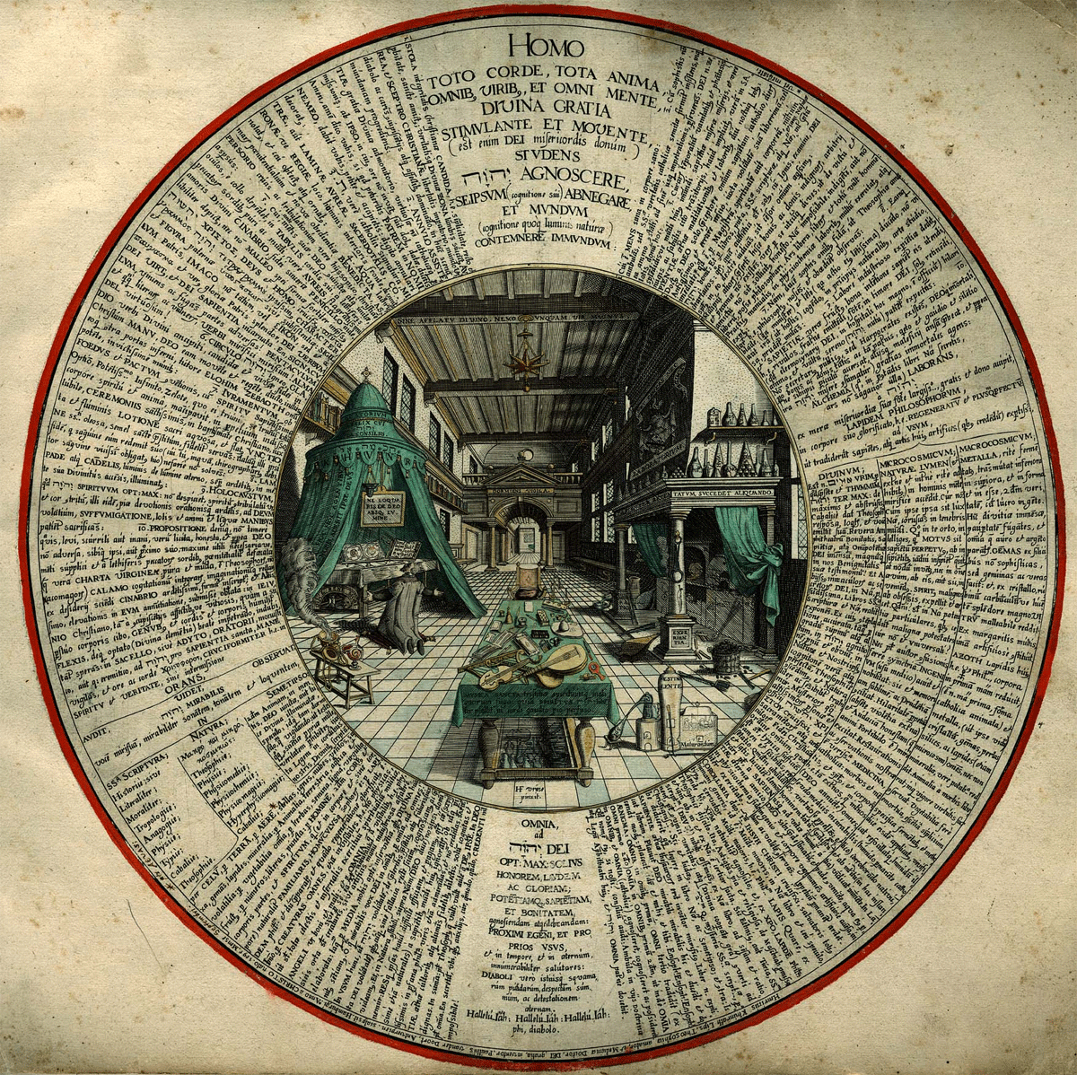 Alchemist's Laboratory Surrounding the circular image of the alchemist's laboratory and oratory is engraved text. Homo toto corde, tota anima, omnibus uiribus, et omni mente, diuina gratia stimulante et mouente, (est enim Dei misericordis donum) studens yhvh[1] agnoscere, se ipsum (cognitione sui) abnegare, et mundum (cognitione quoque luminis naturae) contemnere immundum: [Google translate: A man with his whole heart, whole soul, with all our strength, and to every mind, by divine grace and the instigation of moves, (for it is the gift of God most merciful) yhvh striving to acknowledge himself (knowledge of) to deny, and the world (also light the knowledge of nature) unclean to despise:] 1. Stola integritatis Christianae candida, hoc est simplicitate, recto et probitate, sancte amictus; ueritatisque diuinae zona lumbis succinctus aurea, et sceptro Christianae libertatis imperatorio, mundo uidelicet, diabolo ac carnis concupiscentiis atque affectibus dominando, in hanc scenam mundanam progrediens. [Google translate: Integrity of the Christian white robe, that is simplicity, the nominative case and integrity, of the holy attire; girded about the loins with a girdle of gold ueritatisque divine, Christian liberty, scepter, and the empire, namely the world, the devil and the lusts of the flesh and emotions sway, on this worldly stage to proceed further. 2. Anulo assistentiae gratiae Diuinae admonitorio, uirtuosae uidelicet catholicaeque promissionis, ab ipso, in cuius ore non inuentus fuit dolus, datae, dicentis, Amen, amen dico uobis, si quid petieritis Patrem in nomine meo, dabit uobis, petite et accipietis: digito anulari decoratus. [Google translate: Ring insurance admonitorio to divine grace, namely virtuous catholicaeque of promise, by him, in whose mouth was no guile was found, given to them, saying, Verily, verily, I say unto you, Whatsoever ye shall ask the Father in my name, will give you, ask and you shall receive: the finger with the RING-MAKER.] 3. T, uere catholici signatura, mitrae, aut laminae aureae sacerdotalis, coronaeue regiae loco, hominis interioris fronte, diuinitus notatus, et ceu obtectus atque ornatus. [Google translate: T, truly Catholic Signatura, bonnets, with plates of gold, or priestly, royal coronaeue place, the inner man, the forehead, divinely noted, and as covered by its treasures and ornaments.] 4. Aqua lachrymarum paenitentialium et nouae oboedientiae benedicta, aspersorio crucis ac tribulationum uere hyssopico, Christiane aspersus. [Google translate: Tears of penance for water and blessed the new obedience, truly hyssopico aspersorio with crosses and tribulations, sprinkled with the Christian.] 5. Cui, ante mentis suae, Deo, coniunctae atque unitae, oculos, e collo dependet, in tabulis cordis sui, a lethiferis peccatorum sordibus puri ac mundi, uere aureis, flagrantissimi amoris Diuini cinabrio, fidei sincerae penicillo indelibiliter depictus, nec non malleo spei firmae fortiter impressus yehoshua Christos, Deus et homo, crucifixus; pentagrammos yhvh tetragrammos ipsissimus character, et figura paternae hypozateôs siue subsisentiae: sigillum Patris, imago non tantum, uel eikôn sed et apaugasma et uerus gloriae Patris splendor, Dei uerbum, Dei uirtus, et Dei sapientia incarnata. En, signaculum, uincens ac fugans partes aduersas! Pentaculum et quinque literarum ac uulnerum, uerbi mirifici mirificum! Almadel uirtuosum! [Google translate: To whom, before the of his mind, God, joined together and united, the eyes, from his neck depends, in the tables of his heart, from the pure filth of sins and the world's lethiferis, truly golden, divine love cinabrio his ardent, sincere faith indelibiliter brush painted, he would not be impaired with the hammer of hope strongly imprinted on yehoshua Christos, God and man, was crucified; pentagrammos yhvh tetragrammos ipsissimus a character, and the figure of his father's or hypozateôs subsisentiae: seal of the Father, not only the image, or eikôn apaugasma and true but also the splendor of the Father of glory, the Word of God, the power of God and of God the wisdom incarnate. Behold, a seal, and scatters uincens parts and adversity! Pentaculum and the wounds and five letters, the word wonderfully wonderful! Almadel virtuous! 6. Circulo yhvh igneo, gladio uerbi Diuini ancipiti, candidae et uiuae fidei in Christum manu, Deo eam mouente et regente, ducto, inclusus eoque contra portas inferni, tutore Elohim Zebaoth omnipotente, inuictissime munitus. [Google translate: Yhvh a fiery circle, two-edged sword of the word divine, bright and living faith in the hand of Christ, and God was governing it moves, drawing, and so shut up against the gates of hell, guardian Almighty Elohim of Hosts, protected by the invincible. 7. Iramentum, ob foedus et pactum conuentionis, cum Spiritu sapientissimo optimo, potentissimo, infinito, zelote, quo ei triuni, se triunum totum corpore, spiritu, et anima, mancipauit, in perpetuum indissolubile, ceremoniis sanctissimis, in baptismate Christiano, iuxta et fluminis lotione sacri aquosa, et flatus unctione sacrosancti oleosa, semel sancte praestitum, fideliter seruans: datamque illi ipsi fidem, qui sanguine eum redemit suo (cui tu, inquam, chirographarius debitor sanguine uicissim obligatus tuo) nefarie non soluens. [Google translate: Iramentum, because of his covenant and the covenant conuentionis, when the Spirit of wisdom and the best, most powerful, the infinite, the Zealot, which triuni him, he triunum the whole body, spirit, and soul, devoted, for ever indissoluble, most holy ceremonies, in the Baptism the Christian, and of the river, according to lotione sacred watery, oily substances and breath of the anointing of the Most Holy, holy once performed, faithfully keeper: datamque, these very men the faith who redeemed him his blood (to whom you, I say, a debtor chirographarius bound to turn your blood) is not unfolding wickedly.