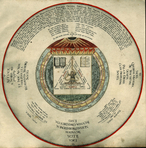 2. Quemadmodum bonorum mundanorum pars decima solet impendi Deo, in causis piis; nouem uero usui mundano: ita, in contrario, Theosophum decet, decimam dumtaxat Lapidis huius partem, usibus impendere munandis, nouem uero reliquas soli Deo, in proximo, egeno. Quod eleemosynarii Dei, in hospitali hoc magno, est proprium. Sigillum naturae et artis, simplicitas. [Google translate: As part of the tenth of worldly goods is usually expended to God, in cases pious; nine worldly use, but I will now, in the opposite, THEOSOPHY fitting, only the tenth part of this stone, to expend munandis uses, and nine, however, the rest to God alone, in the next, the needy. That eleemosynarii of God, in this great hospital, is a property. Seal of nature and art, the simplicity.] Dixi. [Google translate: I said.] Henricus Khunrath Lips. Theosophiae amator, et Medicinae Doctor, Dei gratia, inuentor, Paullus uander Doort [Paulus vander Doort], Antverpien, scalpsit, Hamburgi, Anno a Christo nato 1595. Mense Iulio. [Google translate: Henry Khunrath Boston. Theosophiae a lover, Doctor and medicine, the grace of God, the inventor, Paullus uander Door [Paul Vander Door], Antverpien, scalpsit, Hamburg, in the year 1595 from the birth of Christ. In July.] _______________ Notes [1] Cf. Tac. Ann. 15.12. [2] Tetragammon. [3] Editions of 1595 and 1653: terreo. [4] Cf. Verg. Aen. 1.26. The four, the three, the two, the one Surrounding the circular image of the the Four, the Three, the Two, the One is engraved text. Decebit nos, igitur, prius pie lotos atque paenitentialiter purgatos, offerre, supplicesque, fide sincera, commendare deificae luci, et tunc, illam sapientiae aeternae, desuper rorantem mannam, supercaelestisque nectaream, et aquae et ignis, pluuiam, sicut stillicidia stillantia super terram, in corda, animas, uires mentesque nostras, hoc est in corpus, spiritum et animam, siue ternarium Microcosmicon renatum, descendentem, praeclusis sensibus seditiosis, mente quieta affectuque omni puro, fixe durantibus, tam immediate quam mediate, iuxta et dormientes ac uigilantes, patienter expectare; et sic, diuinitus, accendi; illustrari; illuminari; sanctificari; yhvh[1] frui; diuina pati; immo, in Deum, ineffabiliter, rapi; et quasi deificari. Laudantes interdum et adorantes (in soliloquiis, praesertim, iisque quotidianis, ut plurimum, matutinis) id pelagus misericordiae immensum, oceanuumque bonitatis omnis infinitum; ex quo, non tantum uerbi mirifici yehoshua Christou crucifixi, et sacrorum yhvh nominum atque uerborum omnium (quae, quoad nos, mansiones sunt sensibiles Diuinitatis, nec non memoracula nos docentia: stimulantia quoque, adiuuantia et eleuantia appetitum animae, mentisque, in nobis, operationem admirandam, in nosmet ipsos et extra nos, uirtuose promouentia) numen designantium et simul exhibentium; uerum etiam mirabilium omnium (facit enim yhvh mirabilia solus) ad nos usque deriuantur radii, destillant fluenta, et diuinissimi emanant riui. O felix terque quaterque felix, in admirationem, meditationem, amorem et perceptionem horum, qui rapitur. Numen, sic, summum, realiter praesens sentiemus; yhvh mirabilem, et in nobis, et in natura, et in scriptura, mirifice loquentem, ueridice audiemus, sufficienter uidebimus, fructuose obseruabimus; angelos bonos, nobis amice assistentes, nos fideliter monentes. yhvh iussu benigno familiariter docentes, atque in uiis nostris tuto ducentes, sine fallacia experiemur. Humi, igitur, procidentibus nobis, hic hymnus, aliique huic non ab similes, Ionico modulamine et accentu, sacris animi concitandi causa, debito, proferendus est: [Google translate: Decebit us, therefore, before, and having washed them with godly paenitentialiter cleared, to offer, as suppliants, sincere faith, to commend the deifying light, and at that time, that of eternal wisdom, the dripping manna from above, supercaelestisque nectar, and water and fire, rain, a drop stillantia upon the earth, in the hearts, souls, and minds of our strength, that is into the body, the spirit and the soul, or three Microcosmicon born again, coming down, shut seditious senses, all with a pure mind and feeling quiet, fixedly during its course, both immediately and mediately, in accordance with, and watching and sleeping, patiently to wait on and so, divinely, lighted; illustrated; enlightened, sanctified; yhvh to enjoy; to suffer divine things, for one, against God, ineffably, steal, and as it were, deified. Sometimes in praise and those who worship (in the soliloquies, especially, and those daily, for the most part, rising in the morning) that the main mercy immense, oceanuumque all infinite goodness, from which, not only of the word wonderfully yehoshua Christou crucified, and the sacred words, and names of all yhvh (which, as long as us, are sensible mansions of divinity, nor the teacher does not memoracula us: the instigation of, too, and help eleuantia appetite of the soul, the mind, in us, admire the operation, in ourselves and outside of us, virtuous promouentia) designating and divinity are presenting at the same time, but also of all wonders (yhvh wonderful things for it makes us the only) to us in the deriuantur rays, destillant streams, and streams of the divine they emanate. O happy thrice and four times happy, in admiration, meditation, love and perception of these, who is carried away. Deity, thus, the summit, the feel is really present; yhvh wonderful, and in us, and in nature and in writing, speaking wonderfully, we will hear ueridice sufficiently we shall see, have benefited from obseruabimus; the good angels, to us, Friend, assistants, who warns us faithfully. yhvh by order of a familiar kind, teaching, and leading safety in our streets, without the deceitfulness of experience. On the ground, therefore, they fell to us, the same hymn, not from this and other similar, Ionic accent and music, to inspire the mind the sacred cause, due to utter is:] Rei omnis generatorque opifexque, [Google translate: Generatorque opif