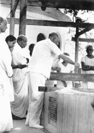 André had noted in his diary a decision taken by the Mother in May 1973 to submit entirely to the Divine’s Will and give up her attempt to transform her body. He wrote that there was a marked difference from that day onwards. But André never published it because since it was an oral conversation, he was reluctant to put it in print lest it created unnecessary controversy. André at the Samadhi; also are seen Udar, Nolini and Dyuman _______________ Notes: [1] Ibid., p. 36 Part F It is often debated as how well did André realize the importance of the Work, that is, the Yoga of Transformation, the Mother was carrying on in her body. Some people claim that what he understood was next to nothing, for he never practised the Integral Yoga. On the other hand, those who knew him well and were quite close to him argue that he did practise the Integral Yoga and was fortunate enough to receive certain spiritual experiences, though he never talked about them, as the Mother had instructed him not to do so. (In an e-mail to the author, Janine had written: “My father never talked about his spiritual experiences.” Pournaprema supported this statement and had informed the author in an e-mail sent a few months before her death: “André was a disciple of Sri Aurobindo and the Mother. Following their advice, he never spoke about his spiritual experiences except to them.”) This argument might go on for ever, for André was always silent about his spiritual experiences and since appearance is always different from reality, no conclusion would be drawn. But from his writings, one can at least get an idea about how well did he understand Sri Aurobindo and his teachings. Let’s quote some portions of an article he wrote soon after Sri Aurobindo’s mahasamadhi; it was published in the Sri Aurobindo Circle (9th Number, 1953):