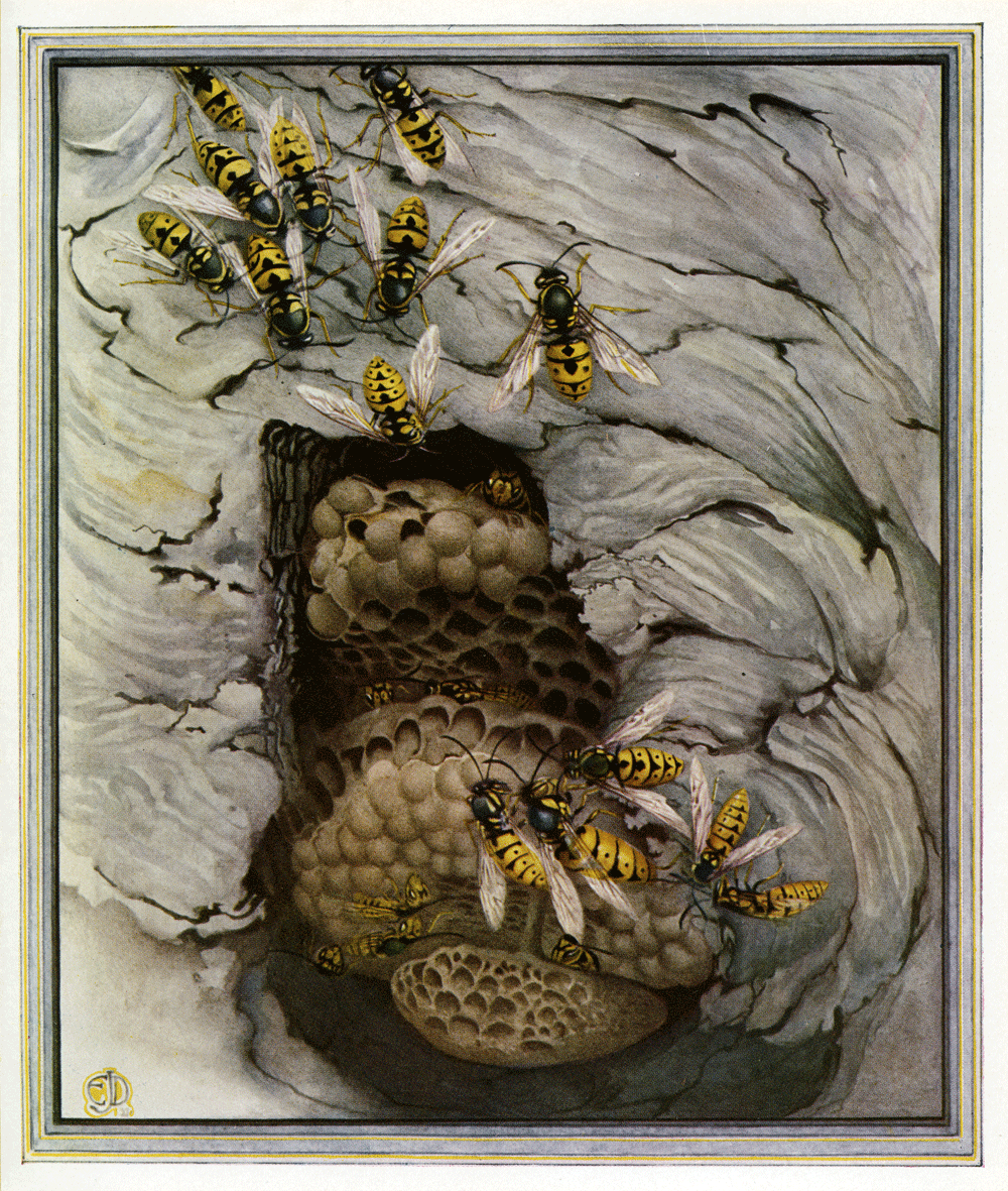 CHAPTER 10: COMMON WASPS I: THEIR CLEVERNESS AND STUPIDITY WISHING to observe a Wasp's nest I go out, one day in September, with my little son Paul, who helps me with his good sight and his undivided attention. We look with interest at the edges of the footpaths. Suddenly Paul cries: "A Wasp's nest! A Wasp's nest, as sure as anything!" For, twenty yards away, he has seen rising from the ground, shooting up and flying away, now one and then another swiftly moving object, as though some tiny crater in the grass were hurling them forth. We approach the spot with caution, fearing to attract the attention of the fierce creatures. At the entrance-door of their dwelling, a round opening large enough to admit a man's thumb, the inmates come and go, busily passing one another as they fly in opposite directions. Burr! A shudder runs through me at the thought of the unpleasant time we should have, did we incite these irritable warriors to attack us by inspecting them too closely. Without further investigation, which might cost us too dear, we mark the spot, and resolve to return at nightfall. By that time all the inhabitants of the nest will have come home from the fields. The conquest of a nest of Common Wasps would be rather a serious undertaking if one did not act with a certain amount of prudence. Half a pint of petrol, a reed-stump nine inches long, and a good-sized lump of clay or loam, kneaded to the right consistency — such are my weapons, which I have come to consider the best and simplest, after various trials with less successful means. The suffocating method is necessary, unless I use costly measures which I cannot afford. When Reaumur wanted to place a live Wasp's nest in a glass case with a view to observing the habits of the inmates, he employed helpers who were used to the painful job, and were willing, for a handsome reward, to serve the man of science at the cost of their skins. But I, who should have to pay with my own skin, think twice before digging up the nest I desire. I begin by suffocating the inhabitants. Dead Wasps do not sting. It is a brutal method, but perfectly safe. I use petrol because its effects are not too violent, and in order to make my observations I wish to leave a small number of survivors. The question is how to introduce it into the cavity containing the Wasp's nest. A vestibule, or entrance-passage, about nine inches long, and very nearly horizontal, leads to the underground cells. To pour the petrol straight into the mouths of this tunnel would be a blunder that might have serious consequences later on. For so small a quantity of petrol would be absorbed by the soil and would never reach the nest; and next day, when we might think we were digging safely, we should find an infuriated swarm under the spade. The bit of reed prevents this mishap. When inserted into the passage it forms a water-tight funnel, and carries the petrol to the cavern without the loss of a drop, and as quickly as possible. Then we fix the lump of kneaded clay into the entrance- hole, like a stopper. We have nothing to do now but wait. When we are going to perform this operation Paul and I set out, carrying a lantern and a basket with the implements, at nine o'clock on some mild, moonlit evening. While the farm-house Dogs are yelping at each other in the distance, and the Screech Owl is hooting in the olive-trees, and the Italian Crickets are performing their symphony in the bushes, Paul and I chat about insects. He asks questions, eager to learn, and I tell him the little that I know. So delightful are our nights of Wasp-hunting that we think little of the loss of sleep or the chance of being stung! The pushing of the reed into the hole is the most delicate matter. Since the direction of the passage is unknown there is some hesitation, and sometimes sentries come flying out of the Wasp's guard-house to attack the operator's hand. To prevent this one of us keeps watch, and drives away the enemy with a handkerchief. And after all, a swelling on one's hand, even if it does smart, is not much to pay for an idea. As the petrol streams into the cavern we hear the threatening buzz of the population underground. Then quick I — the door must be closed with the wet clay, and the clod kicked once or twice with the heel to make the istopper solid. There is nothing more to be done for the present. Off we go to bed. With a spade and a trowel we are back on the spot at dawn. It is wise to be early, because many Wasps will have been out all night, and will want to get into their home while we are digging. The chill of the morning will make them less fierce. In front of the entrance-passage, in which the reed is still sticking, we dig a trench wide enough to allow us free movement. Then the side of this ditch is carefully cut away, slice after slice, until, at a depth of about twenty inches, the Wasp's nest is revealed, uninjured, slung from the roof of a spacious cavity. It is indeed a superb achievement, as large as a fair-sized pumpkin. It hangs free on every side except at the top, where various roots, mostly of couch-grass, penetrate the thickness of the wall and fasten the nest firmly. Its shape is round wherever the ground has been soft, and of the same consistency all through. In stony soil, where the Wasps meet with obstacles in their digging, the sphere becomes more or less misshapen. A space of a hand's-breadth is always left open between the paper nest and the sides of the underground vault. This space is the wide street along which the builders move unhindered at their continual task of enlarging and strengthening the nest, and the passage that leads to the outer world opens into it. Underneath the nest is a much larger unoccupied space, rounded into a big basin, so that the wrapper of the nest can be enlarged as fresh cells are added. This cavity also serves as a dust-bin for refuse. The cavity was dug by the Wasps themselves. Of that there is no doubt; for holes so large and so re