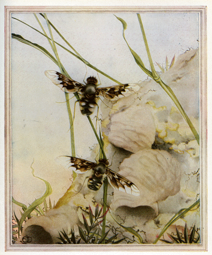 CHAPTER 16: THE ANTHRAX FLY I: A STRANGE MEAL I MADE the acquaintance of the Anthrax in 1855 at Carpentras, when I was searching the slopes of which I have already told you, the slopes beloved of the Anthophora-bees. Her curious pupa, so powerfully equipped to force an outlet for the perfect insect, which is incapable of the least effort, seemed worthy of investigation. For that pupa is armed with a plough- share in front, a trident at its tail, and rows of harpoons on its back, with which to rip open the Osmia-bee's cocoon and break through the hard crust of the hillside. Let us, some day in July, knock away the pebbles that fasten the nests of the Mason-bees to the sloping ground on which they are built. Loosened by the shock, the dome comes off cleanly, all in one piece. Moreover — and this is a great advantage — the cells are all exposed at the base of the nest, for at this point they have no other wall than the surface of the pebble. Without any scraping, which would be wearisome work for us and dangerous to the Bees, we have all the cells before our eyes, together with their contents — a silky, amber-yellow cocoon, as delicate and transparent as the skin of an onion. Let us split the dainty wrappers with the scissors, cell by cell, one after another. If fortune be at all kind, as it always is to the persevering, we shall end by finding cocoons harbouring two larvae together, one more or less faded in appearance, the other fresh and plump. We shall also find some, no less plentiful, in which the withered larva is accompanied by a family of little grubs wriggling un- easily round it. It is easy to see that a tragedy is happening under the cover of the cocoon. The flabby, faded larva is the Mason-bee's. A month ago, in June, having finished its ration of honey, it wove itself a silken sheath in which to take the long sleep that precedes its transformation. It was bulging with fat, and was a rich and a defenceless morsel for any enemy that could reach it. And enemies did reach it. In spite of obstacles that might well seem insurmountable, the wall of mortar and dome-shaped cover, the enemy grubs appeared in the secret retreat, and began to eat the sleeper. Three different species take part in this murderous work, often in the same nest, in adjoining cells. We will concern ourselves only with the Anthrax Fly. The grub, when it has eaten its victim and is left alone in the Mason-bee's cocoon, is a naked worm, smooth, leg- less, and blind. It is creamy-white, and each of its segments or divisions forms a perfect ring, very much curved when at rest, but almost straight when disturbed. Including the head I can count thirteen segments, well-marked in the middle of the body, but in the fore-part difficult to distinguish. The white, soft head shows no sign of any mouth, and is no bigger than a tiny pin's head. The grub has four pale red stigmata, or openings through which to breathe, two in front and two behind, as is the rule among Flies. It has no walking-apparatus whatever; it is absolutely incapable of shifting its position. If I disturb its rest, it curves and straightens itself alternately, tossing about violently where it lies; but it does not manage to progress. But the most interesting point about the grub of the Anthrax is its manner of eating. A most unexpected fact attracts our attention: the curious ease with which this larva leaves and returns to the Bee-grub on which it is feeding. After watching flesh-eating grubs at hundreds and hundreds of meals, I suddenly find myself confronted with a manner of eating that is entirely unlike anything I ever saw before. This, for instance, is the Amophila-grub's way of devouring its caterpillar. A hole is made in the victim's side, and the head and neck of the grub dives deep into the wound. It never withdraws its head, never pauses to take breath. The voracious animal always goes for-ward, chewing, swallowing, digesting, until the caterpillar's skin is empty. Once the meal is begun, the creature does not budge as long as the food lasts. If moved by force it hesitates, and hunts about for the exact spot where it left off eating; for if the caterpillar be attacked at a fresh point it is liable to go bad. In the case of the Anthrax-grub there is none of this mangling, none of this persistent clinging to the original wound. If I tease it with the tip of a pointed brush it at once retires, and there is no wound to be seen on the victim, no sign of broken skin. Soon the grub once more applies its pimple-head to its meal, at any point, no matter where, and keeps itself fixed there without any effort. If I repeat the touch with the brush I see the same sudden retreat and the same calm return to the meal. The ease with which this larva grips, leaves, and re-grips its victim, now here, now there, and always without a wound, shows that the mouth of the Anthrax is not armed with fangs that can dig into the skin and tear it. If the flesh were gashed by pincers of any kind, one or two attempts would be necessary before they could leave go or take hold again; and besides, the skin would be broken. There is nothing of the kind: the grub simply glues its mouth to its prey, and withdraws it. It does not chew its food like the other flesh-eating grub: it does not eat, it inhales. This remarkable fact led me to examine the mouth under the microscope. It is a small conical crater, with yellowish-red sides and very faint lines running round it. At the bottom of this funnel is the opening of the throat. There is not the slightest trace of mandibles or jaws, or any object capable of seizing and grinding food. There is nothing at all but the bowl-shaped opening. I know of no other example of a mouth like this, which I can only compare to a cupping-glass. Its attack is a mere kiss, but what a cruel kiss! To observe the working of this curious machine I placed a new-born Anthrax-grub, together with its prey, in a glass tube. Here I was able to watch the strange