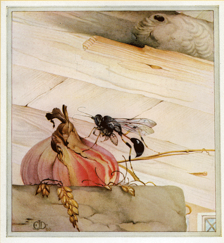 CHAPTER 6: A MASON-WASP I: HER CHOICE OF A BUILDING-SITE OF the various insects that like to make their home in our houses, certainly the most interesting, for her beautiful shape, her curious manners, and her wonderful nest, is a certain Wasp called the Pelopaeus. She is very little known, even to the people by whose fireside she lives. This is owing to her quiet, peaceful ways; she is so very retiring that her host is nearly always ignorant of her presence. It is easy for noisy, tiresome, unpleasant persons to make themselves famous. I will try to rescue this modest creature from her obscurity. The Pelopaeus is an extremely chilly mortal. She pitches her tent under the kindly sun that ripens the olive and prompts the Cicada's song; and even then she needs for her family the additional warmth to be found in our dwellings. Her usual refuge is the peasant's lonely cottage, with its old fig-tree shading the well in front of the door. She chooses one exposed to all the heat of summers, and if possible possessing a big fireplace in which a fire of sticks always burns. The cheerful blaze on winter evenings has a great influence upon her choice, for she knows by the blackness of the chimney that the spot is a likely one. A chimney that is not well glazed by smoke gives her no confidence: people must shiver with cold in that house. During the dog-days in July and August the visitor suddenly appears, seeking a place for her nest. She is not in the least disturbed by the bustle and movement of the household: they take no notice of her nor she of them. She examines — now with her sharp eyes, now with her sensitive antennae — the corners of the blackened ceiling, the rafters, the chimney-piece, the sides of the fireplace especially, and even the inside of the flue. Having finished her inspection and duly approved of the site she flies away, soon to return with the pellet of mud which will form the first layer of the building. The spot she chooses varies greatly, and often it is a very curious one. The temperature of a furnace appears to suit the young Pelopaeus: at least the favourite site is the chimney, on either side of the flue, up to a height of twenty inches or so. This snug shelter has its drawbacks. The smoke gets to the nests, and gives them a glaze of brown or black like that which covers the stonework. They might easily be taken for inequalities in the mortar. This is not a serious matter, provided that the flames do not lick against the nests. That would stew the young Wasps to death in their clay pots. But the mother Wasps seems to understand this: she only places her family in chimneys that are too wide for anything but smoke to reach their sides. But in spite of all her caution one danger remains. It sometimes happens, while the Wasp is building, that the approach to the half-built dwelling is barred to her for a time, or even for the whole day, by a curtain of steam or smoke. Washing-days are most risky. From morning till night the housewife keeps the huge cauldron boiling. The smoke from the hearth, the steam from the cauldron and the wash-tub, form a dense mist in front of the fireplace. It is told of the Water-Ouzel that, to get back to his nest, he will fly through the cataract under a mill-weir. This Wasp is even more daring: with her pellet of mud in her teeth she crosses the cloud of smoke and disappears behind it, where she becomes invisible, so thick is the screen. An irregular chirring sound, the song she sings at her work, alone betrays her presence. The building goes on mysteriously behind the cloud. The song ceases, and the Wasp flies back through the steam, quite un- harmed. She will face this danger repeatedly all day, until the cell is built, stored with food, and closed. Once and once only I was able to observe a Pelopaeus at my own fireside; and, as it happened, it was a washing-day. I had not long been appointed to the Avignon grammar-school. It was close upon two o'clock, and in a few minutes the roll of the drum would summon me to give a scientific lecture to an audience of wool-gatherers. Suddenly I saw a strange, agile insect dart through the steam that rose from the wash-tub. The front part of its body was very thin, and the back part was very plump, and the two parts were joined together by a long thread. It was the Pelopaus, the first I had seen with observant eyes. Being very anxious to become better acquainted with my visitor, I fervently entreated the household not to disturb her in my absence. Things went better than I dared hope. On my return she was still carrying on her mason's work behind the steam. Being eager to see the building of the cells, the nature of the provisions, and the evolution of the young Wasps, I raked the fire so as to decrease the volume of smoke, and for a good two hours I watched the mother Wasp diving through the cloud. Never again, in the forty years that followed, was my fireplace honoured with such a visit. All the further information I have gathered was gleaned on the hearths of my neighbours. The Pelopsus, it appears, is of a solitary and vagrant disposition. She nearly always builds a lonely nest, and unlike many Wasps and Bees, she seldom founds her family at the spot where she was reared herself. She is often found in our southern towns, but on the whole she prefers the peasant's smoky house to the townsman's white villa. Nowhere have I seen her so plentiful as in my village, with its tumble-down cottages burnt yellow by the sun. It is obvious that this Wasp, when she so often chooses the chimney as her abode, is not seeking her own comfort: the site means work, and dangerous work. She seeks the welfare of her family. This family, then, must require a high temperature, such as other Wasps and Bees do not need. I have seen a Pelopaeus nest in the engine-room of a silk-factory, fixed to the ceiling just above the huge boiler. At this spot the thermometer marked 120 degrees all through the year, except at night and on 