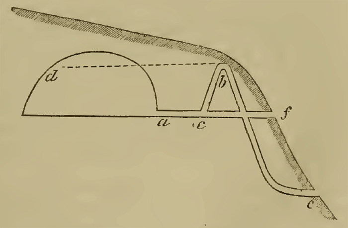 reservoir to d, the level of the highest point of the syphon, it cannot flow through the duct, and it is known that when once it begins to flow it will draw off the water of the reservoir to the orifice a, of the syphon. If the duct be larger than the supply of the reservoir, possibly the force of the waters and loosening of the earth by them, during the storm above mentioned, may have opened a more direct duct as from e to f, horizontally or declining, which issued higher up the hill than the one fed by the syphon. In that case it becomes a common spring. Should this duct be again closed or diminished by any new accident, the syphon may begin to play again, and both springs be kept in action from the same reservoir.